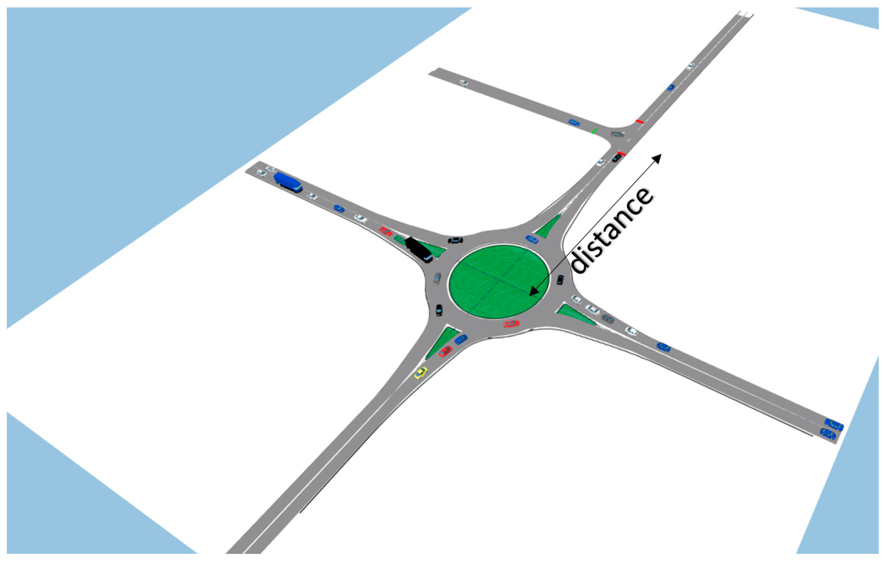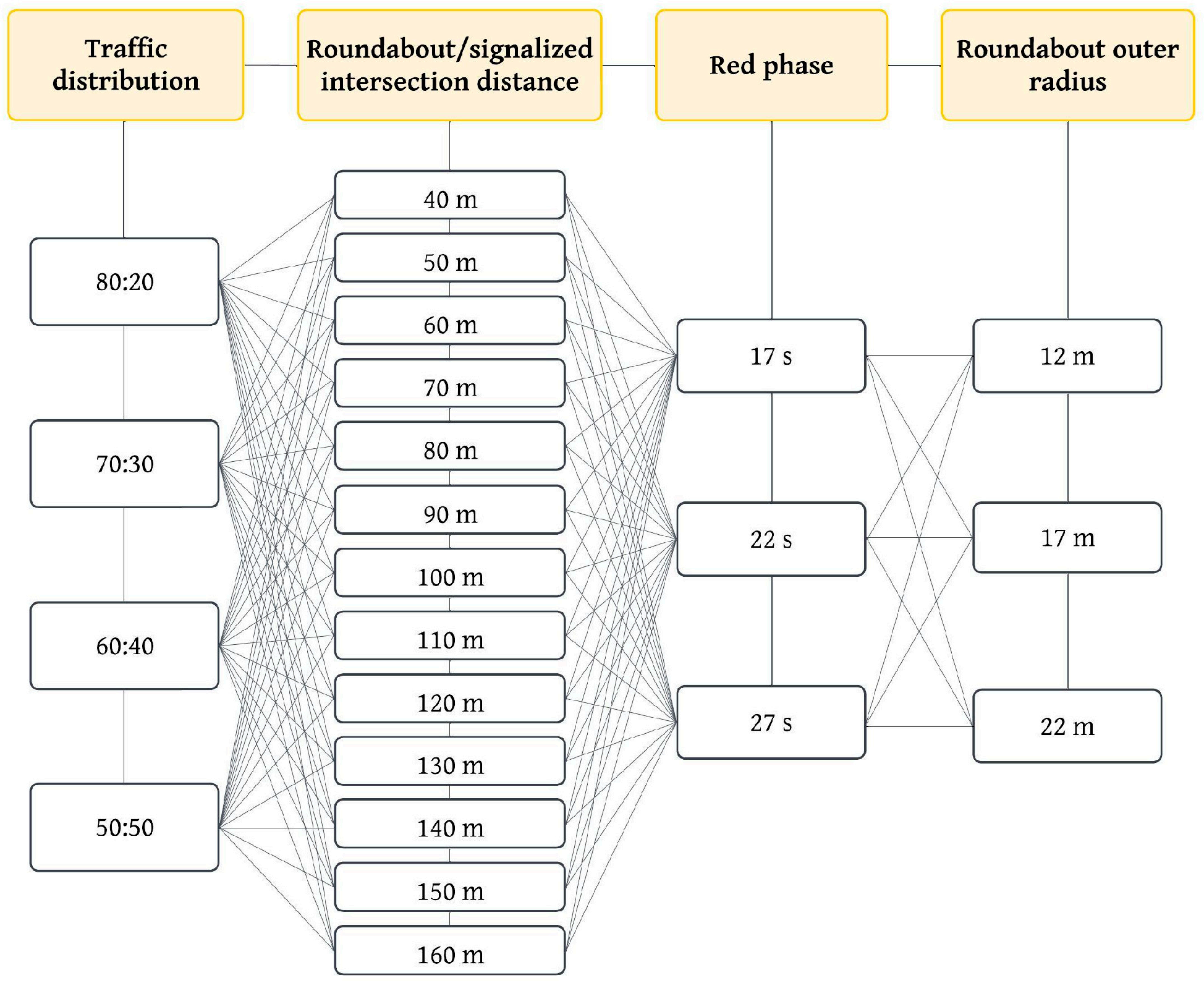 20], a total of ten simulations were conducted for each scenario. This encompassed 12 scenarios of an isolated roundabout and 468 scenarios examining the impact of a signalized intersection on an adjacent roundabout, resulting in a cumulative total of 4800 microsimulations. The duration of the simulation was 24 h and 15 min, which included a 15 min warm-up period during which traffic was loaded into the road network. The remaining time was dedicated to the simulation.