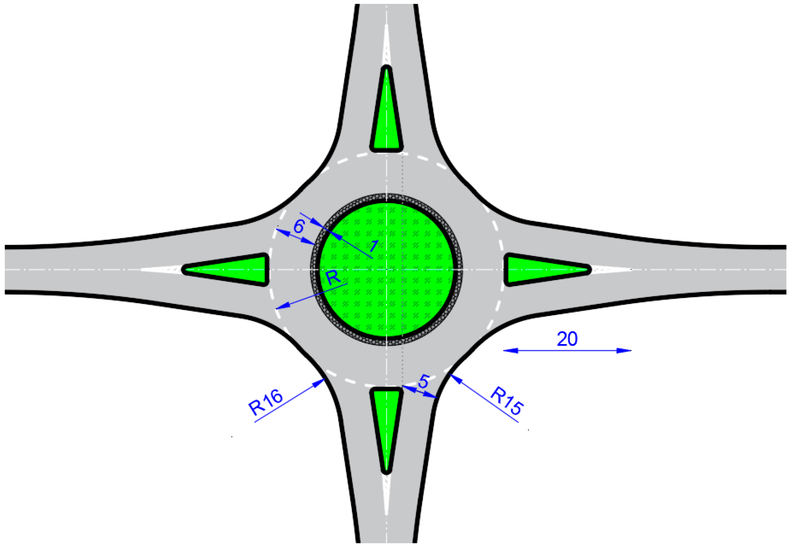 R (m)—outer radius of the roundabout, in the range of 12–22 m.