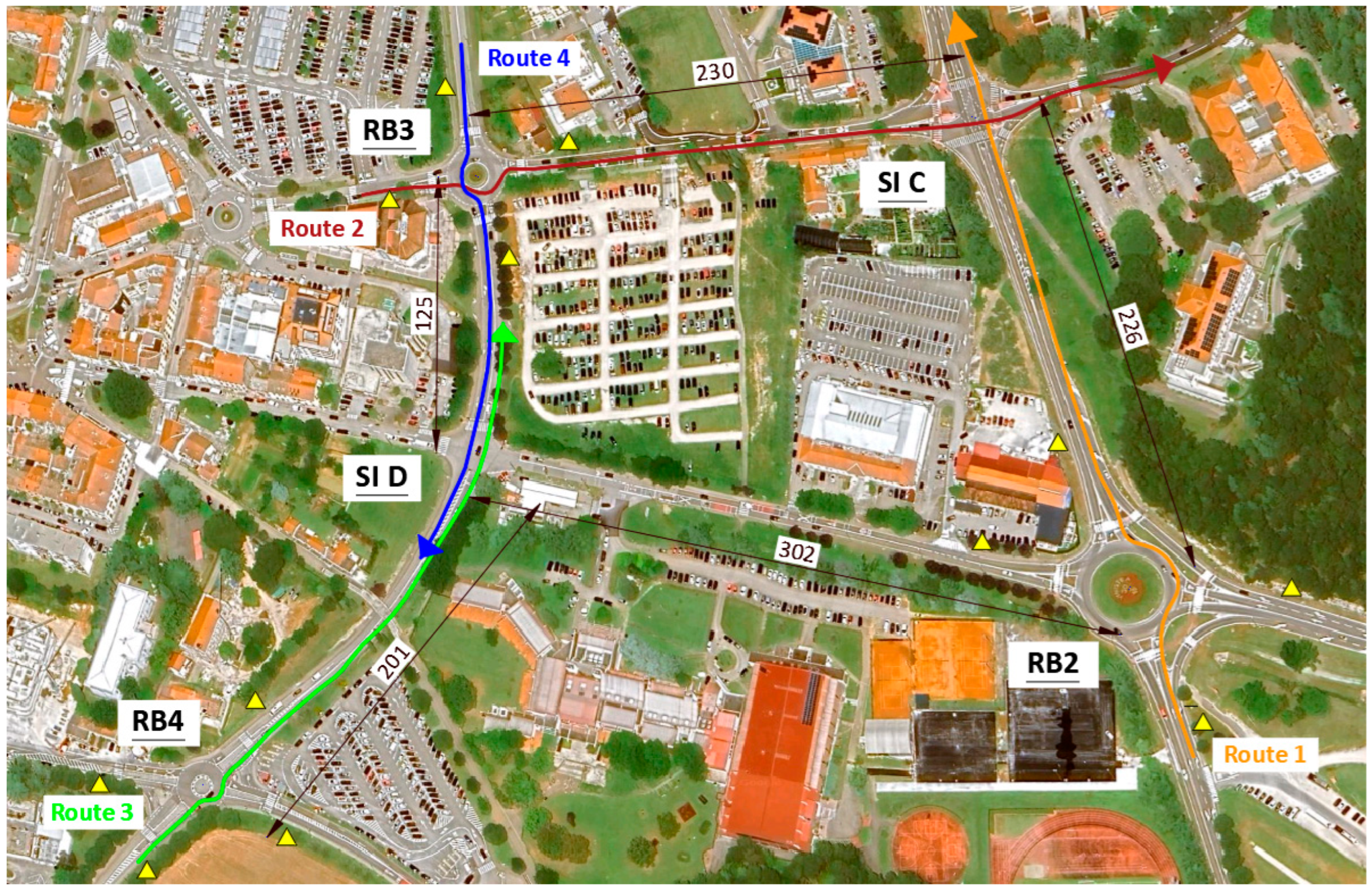 30], these roundabouts are classified as medium-sized urban roundabouts, with outer radii ranging from 15 to 20 m. They are typically constructed in urban areas with relatively high traffic volumes, and their geometric elements are designed to accommodate speeds of up to 40 km/h, with an estimated daily capacity of approximately 20,000 vehicles. The results of these field measurements are detailed in the authors’ previous studies [