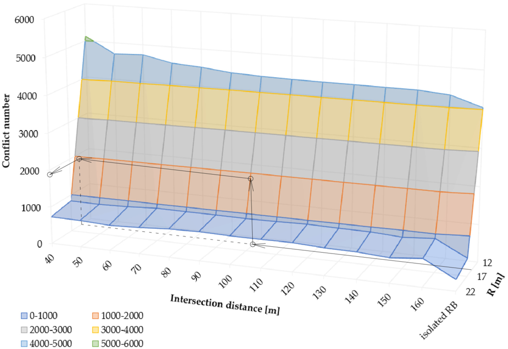 The practical value of the research is reflected in the development of a predictive model and three-dimensional diagrams, which can serve as tools for a rapid evaluation of different road network planning variants. The model for predicting the number of conflicts enables assessing the safety implications of such interventions before the actual construction or reconstruction of an intersection. It complements the findings of the author’s previous study [