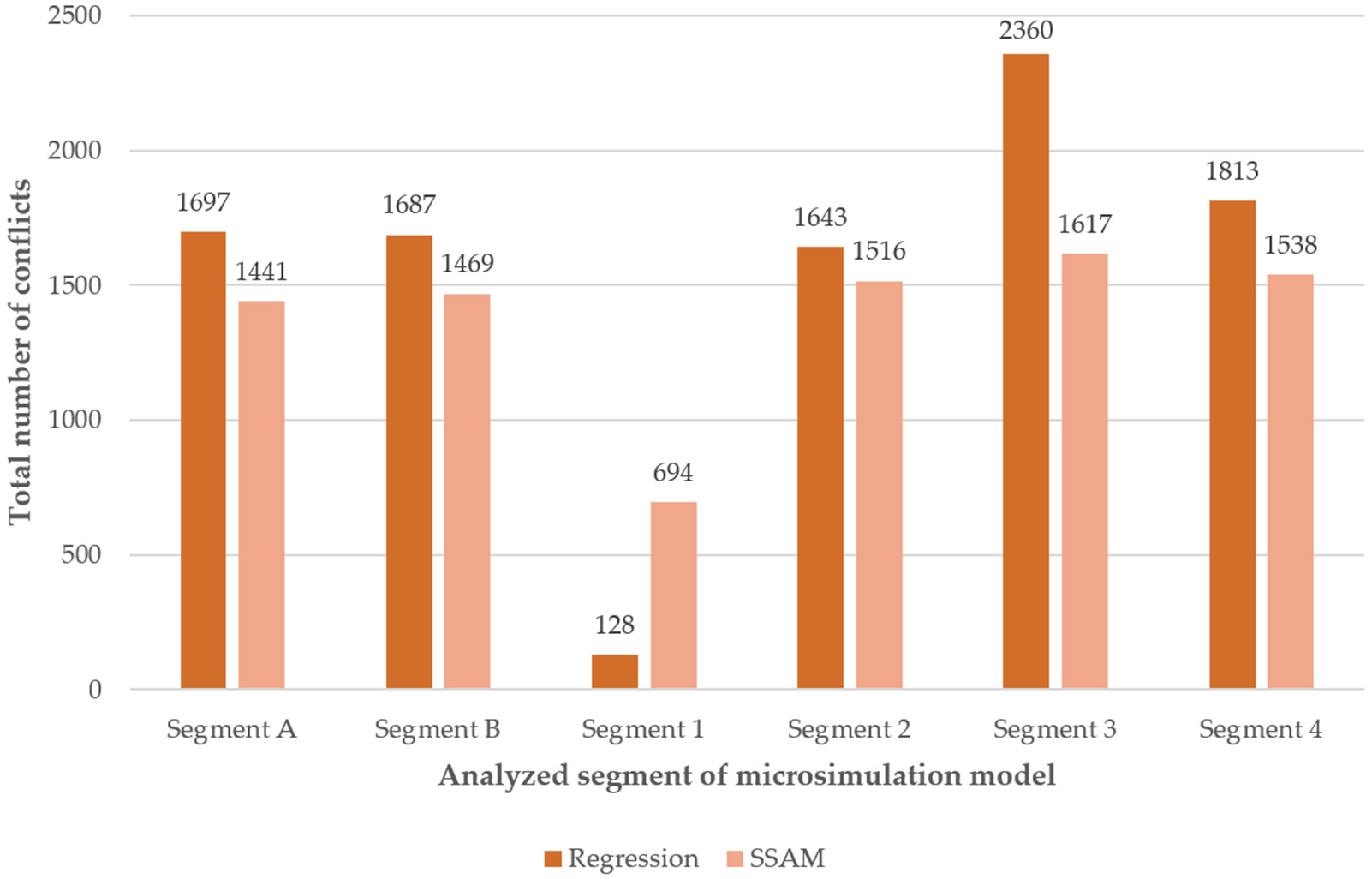 Negative values of the Z statistic in these segments indicate that the SSAM yields slightly lower estimates of the number of conflicts than the regression model; however, the observed differences are not statistically significant. The mean absolute percentage error (MAPE) between the SSAM and regression model results ranges from 7.97% to 15.22%, indicating a very good level of agreement between the two approaches.