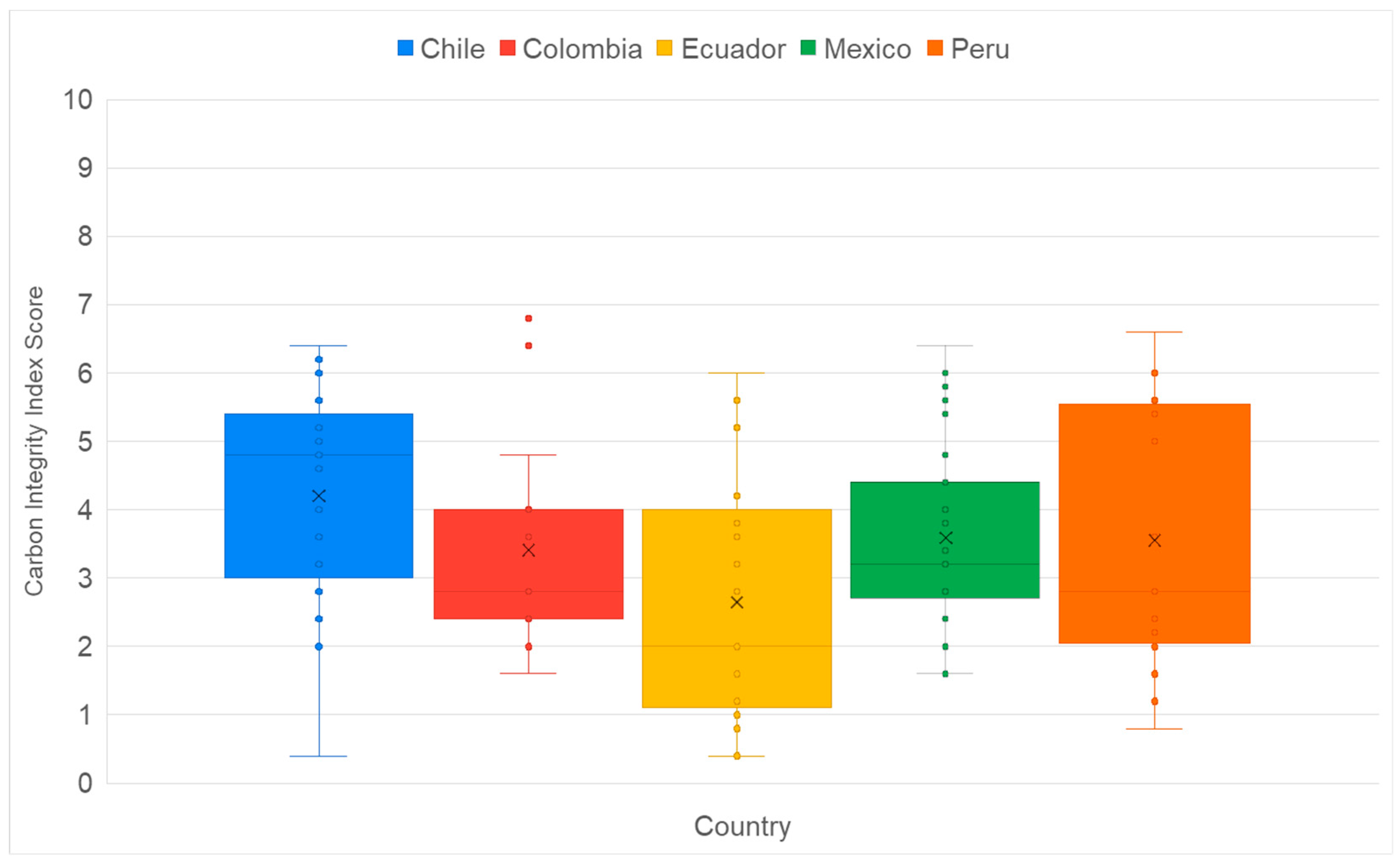 50], establish minimum disclosure thresholds, but are insufficient to motivate rigorous carbon accounting. Although all five countries analyzed reference international frameworks such as the GHG Protocol and GRI, their national regulatory approaches to corporate carbon disclosure differ substantially in terms of mandatory reporting, enforcement mechanisms, and institutional capacity. Chile and Mexico combine mandatory reporting requirements with fiscal or market-based instruments, while Colombia applies sector-specific mandates. In contrast, Ecuador and Peru rely primarily on voluntary or referential disclosure mechanisms. These similarities and differences in regulatory design and enforcement capacity help contextualize the observed convergence of CIX scores at relatively low levels and explain cross-country variability in disclosure quality (