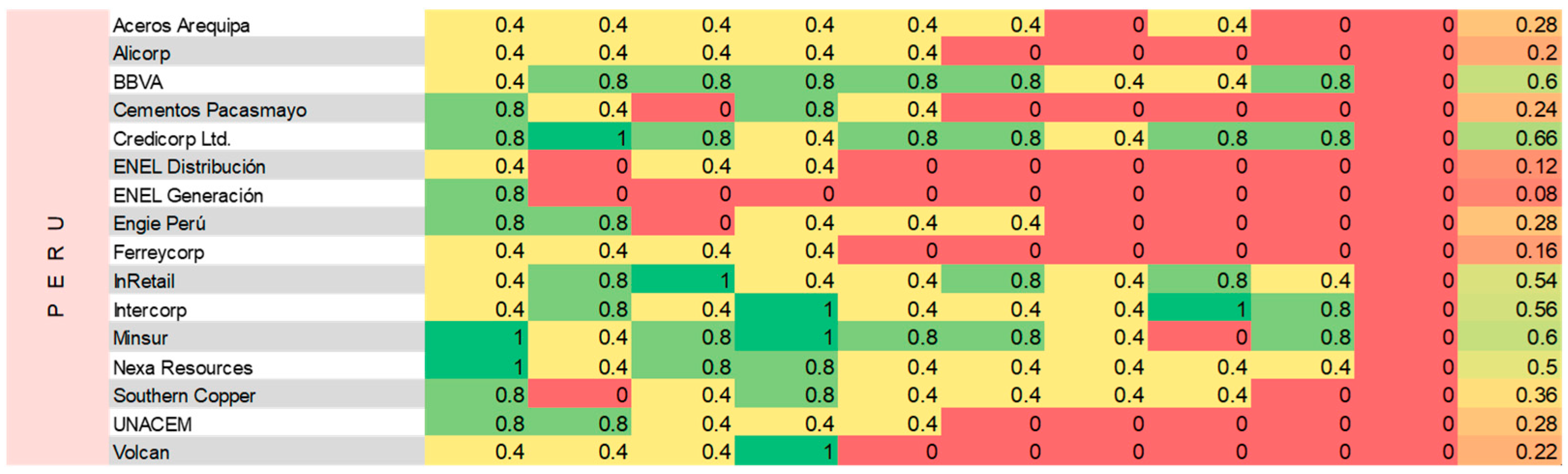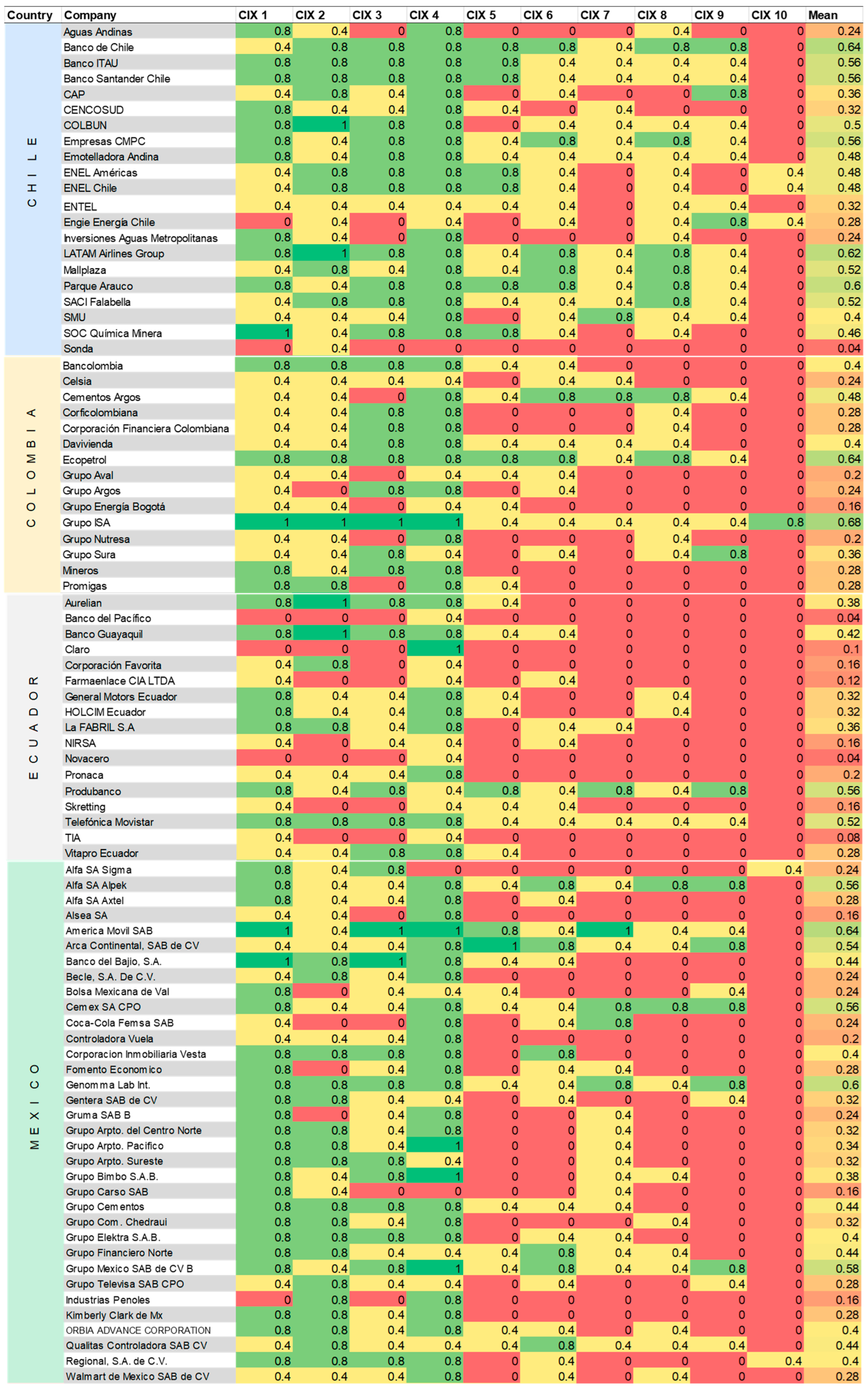 48]. Our findings characterize the disclosure practices among the region’s largest corporations but cannot speak of the broader economic ecosystem. Additionally, our geographic scope excludes major regional economies such as Argentina or Brazil, limiting our ability to make more comprehensive regional claims. Due to the limited size of Ecuador’s stock exchange index (10 companies in the ECUINDEX), a substitutive source, the Ekos business ranking [