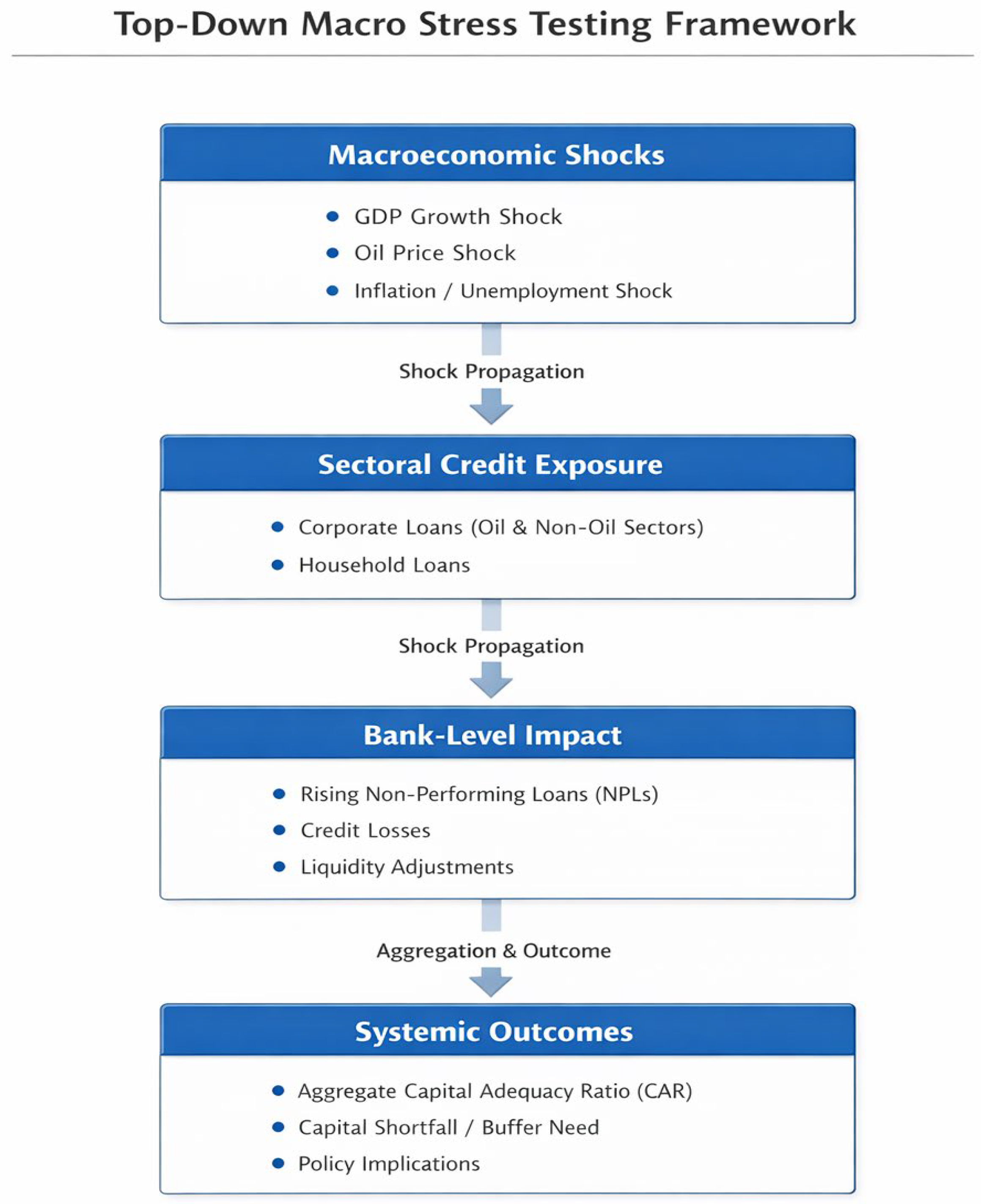 12]. The goal is to design a Top-Down (TD) model that quantifies the resilience of Saudi Arabia’s banking sector under severe but plausible macroeconomic shocks between 2010 and 2025.