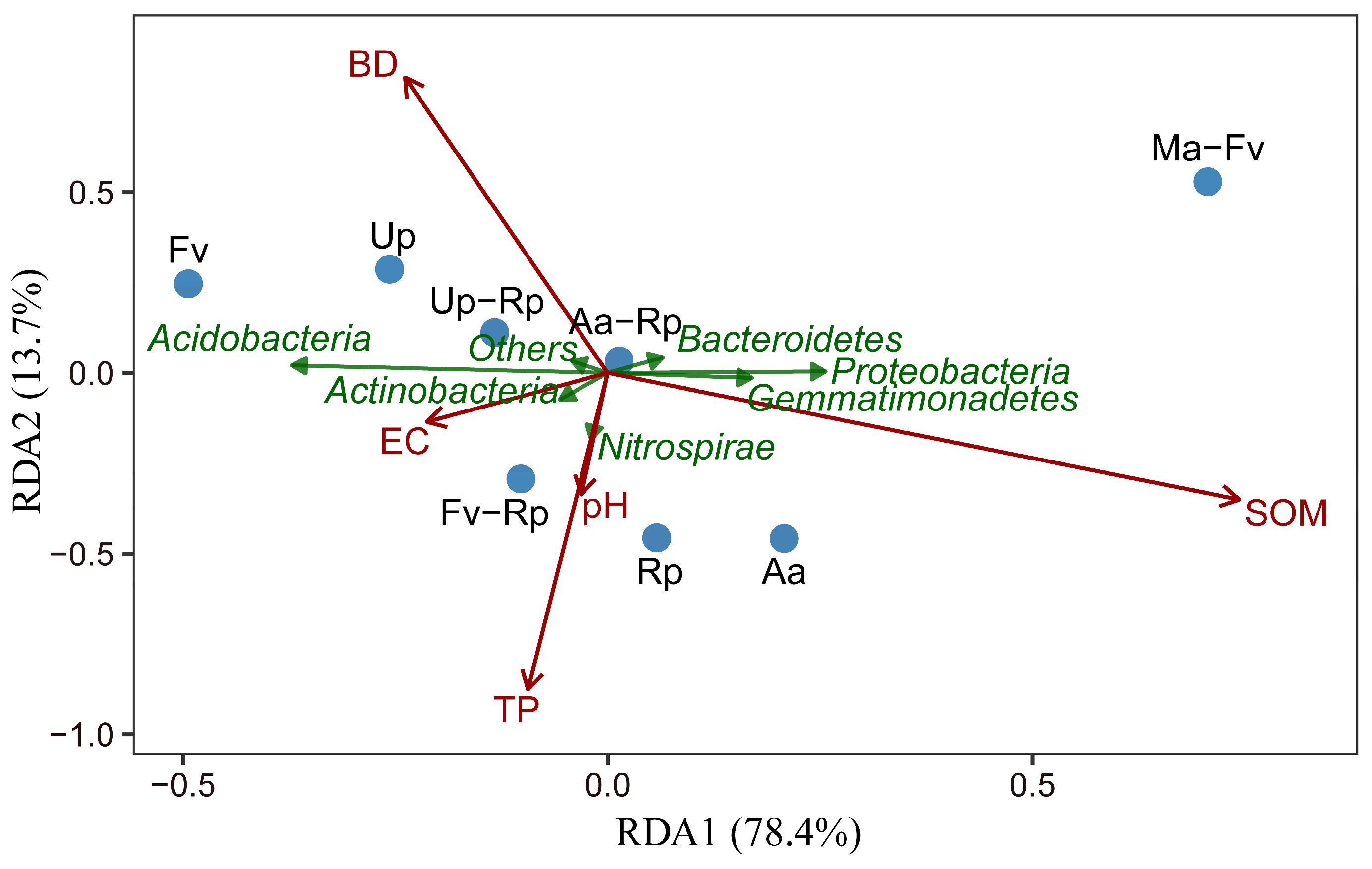 | Sample | pH | EC (μS/cm) | BD (g/cm3) | SOM (g/kg) | TN (g/kg) | TP (mg/kg) |