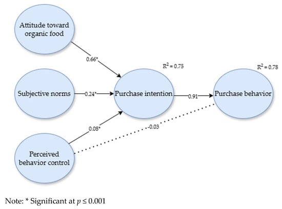 The TPB constructs measured in this study included attitudes towards organic food products (four items) [62], subjective norms (three items) [63], perceived behavior control (five items) [64], purchase intention (three items) [65], and purchase behavior (four items) [38].