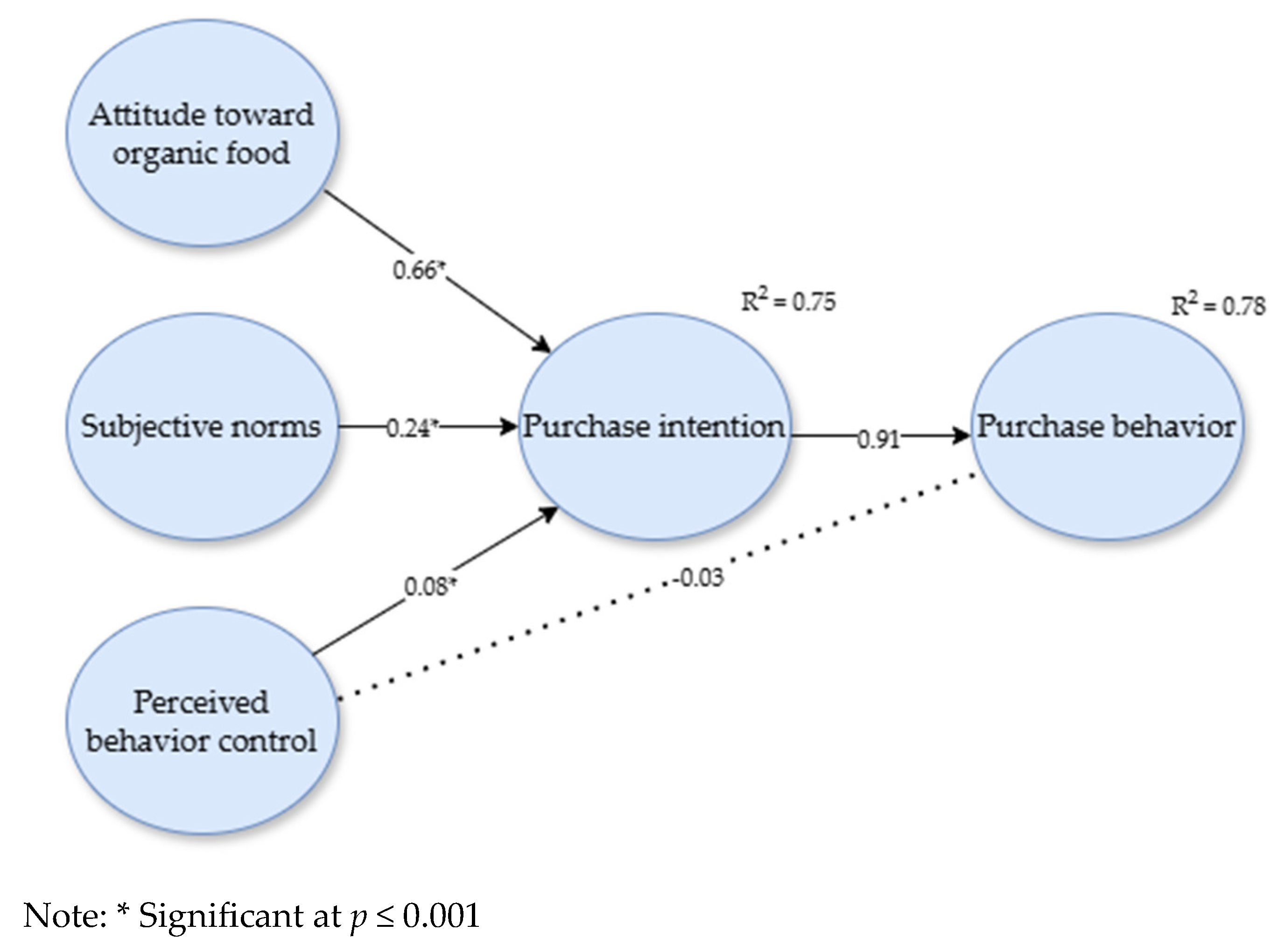 | Hypothesis (H1): Attitude towards organic food products → Purchase intention | 0.66 | 0.000 | Support | |