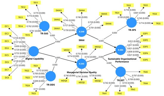 The measurement model in Table 1 shows high reliability and validity among all constructs. Cronbach’s alpha, rho A, and the measurement model show high reliability and validity across all constructs. The values of Cronbach’s alpha, rho A, and composite reliability (rho C) for Digital Capability, SMA Integration, Managerial Decision Quality, Sustainable Organizational Performance, and all Technology Readiness dimensions are above the recommended 0.70, indicating high internal consistency. Likewise, the AVEs for all constructs are greater than 0.50, indicating good convergent validity. The HTMT values indicate that the discriminant validity is acceptable, as the construct correlations are below the conservative threshold of 0.85, suggesting that the constructs are empirically distinct. Predictably, the results of the Digital Capability indicate moderately strong connections with SMA Integration (0.631) and Managerial Decision Quality (0.630), which substantiate the theoretical perspective that digital capability increases accounting integration and decision quality. Sustainable Organizational Performance also shows significant correlations with SMA Integration (0.632) and Managerial Decision Quality (0.612), validating the key roles of information integration and decision quality in generating sustainable outcomes. However, in comparison, the Technology Readiness interaction terms (e.g., TR-DDS × DC, TR-SAS × DC, TR-SPS × SMAI, TR-SET × MDQ) are weakly correlated with most constructs, consistent with their role as moderators rather than core predictors. In general, the table shows that the instrument is statistically strong, that the measures of constructs are valid and reliable, and that the data are properly organized to test the hypothesized relationships in the structural model.
