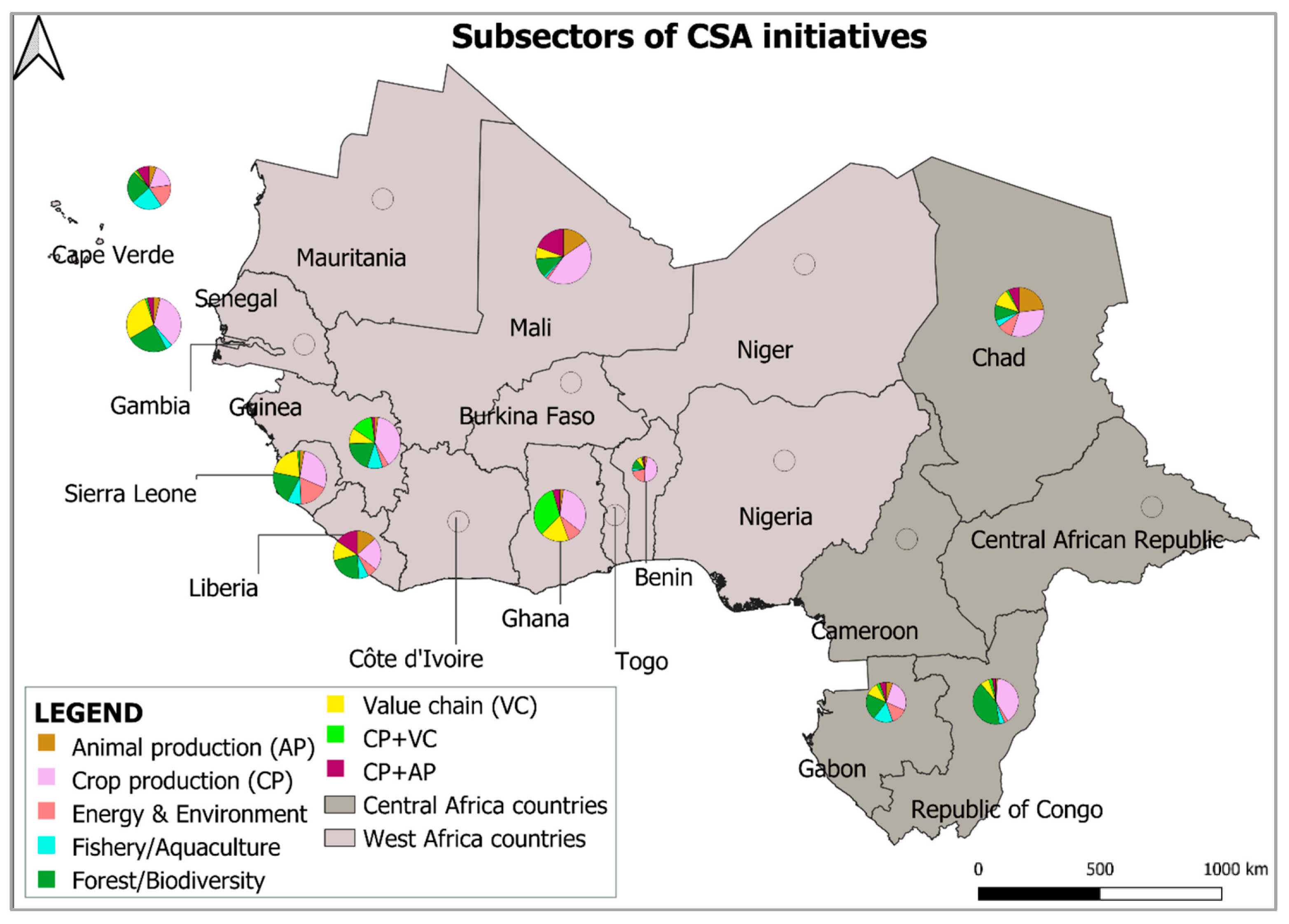 - CSA initiatives are very rare in sub-sectors such as animal production, value chain improvement, access to markets and financing, and energy and environment. This same observation has already been made by [24,25], who identified more potential CSA practices in the crop production sub-sector than the others.