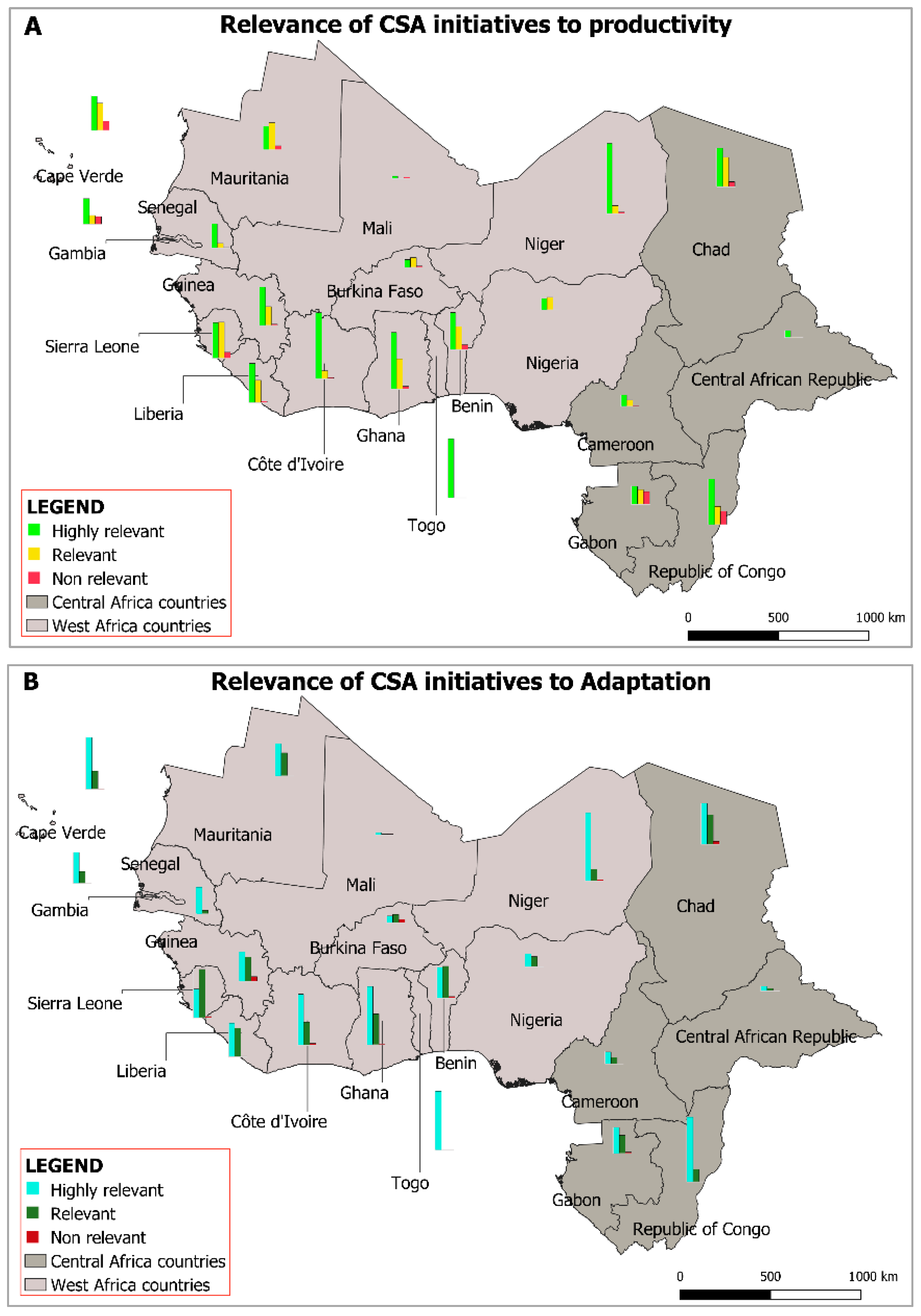 - CSA initiatives in the form of innovation platforms, networks and cooperations, as well as scientific research projects, are very poorly represented, even though they play a vital role in energizing and consolidating the achievements of projects/programs. While scientific research would effectively support the understanding of CSA mechanisms and achievements, the identification of sustainable options and practices in package form (combining practices into a technological package), the designing and testing of new CSA technologies, and the documentation and valorization of CSA actions. Refs. [21,22] have already highlighted the importance and role of research as the backbone for successful implementation of innovative CSA initiatives. Also rare are policy-oriented programs that would constitute the coordinating guideline for CSA actions and initiatives in WCA. The observed disconnection between research outputs and policy uptake reflects structural weaknesses in CSA national innovation systems, including limited science–policy interfaces, weak demand articulation by policymakers, and fragmented institutional mandates. Ref. [23] had already underscored the importance of interaction between science, development, and policy in CSA implementation process. On the other hand, CSA practices and technologies have high potential in overcoming humanitarian challenges that may result from political situations, terrorism, and climate change in West Africa [24].