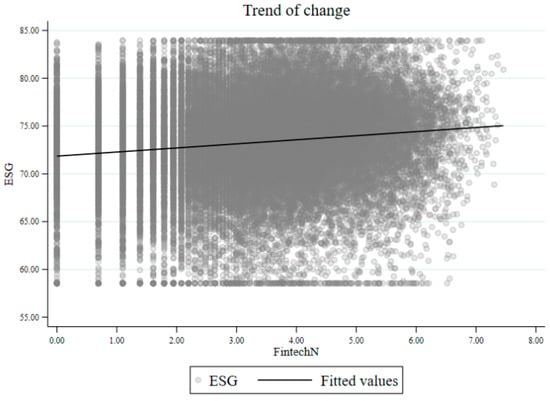 The regression results of control variables show that the coefficients of enterprise SIZE (SIZE), return on assets (ROA), proportion of tangible assets (TAR) and independent directors’ ratio (Indep) are significantly positive. This may be due to several reasons as follows. First, large enterprises have sufficient resource reserves and stronger ESG investment capacity [45]. Second, the idle resources of highly profitable enterprises can support the improvement of ESG performance for a long time [46]. Third, tangible assets can reduce credit risks and help enterprises obtain low-cost funds to invest in ESG-related projects [47]. Fourthly, the supervision mechanism of independent directors promotes ESG practices [48]. Moreover, the coefficients on financial leverage (LEV), Tobin’s Q (TobinQ) and listing years (ListAge) are significantly negative. This pattern can be explained through three channels. First, high leverage imposes debt servicing pressure, which compels firms to prioritize short-term repayment over long-term ESG investments [49]. Second, a high Tobin’s Q might lead to managerial myopia or intensify agency conflicts while reflecting market valuation. Managers often curtail ESG expenditures that bear fruit only in the long run to sustain elevated valuations [34]. Third, longer-listed firms tend to develop organizational inertia and face diluted external monitoring, reducing their incentive to pursue non-mandatory, forward-looking ESG initiatives [50]. Finally, the coefficient on largest shareholder ownership (Top1) is not significant, possibly because its monitoring function has been replaced or overshadowed by more professional governance mechanisms such as board independence, institutional investors and analyst following [51]. Collectively, the regression results offer robust empirical support for Hypothesis 1, suggesting that corporate fintech development enhances enterprise ESG performance.