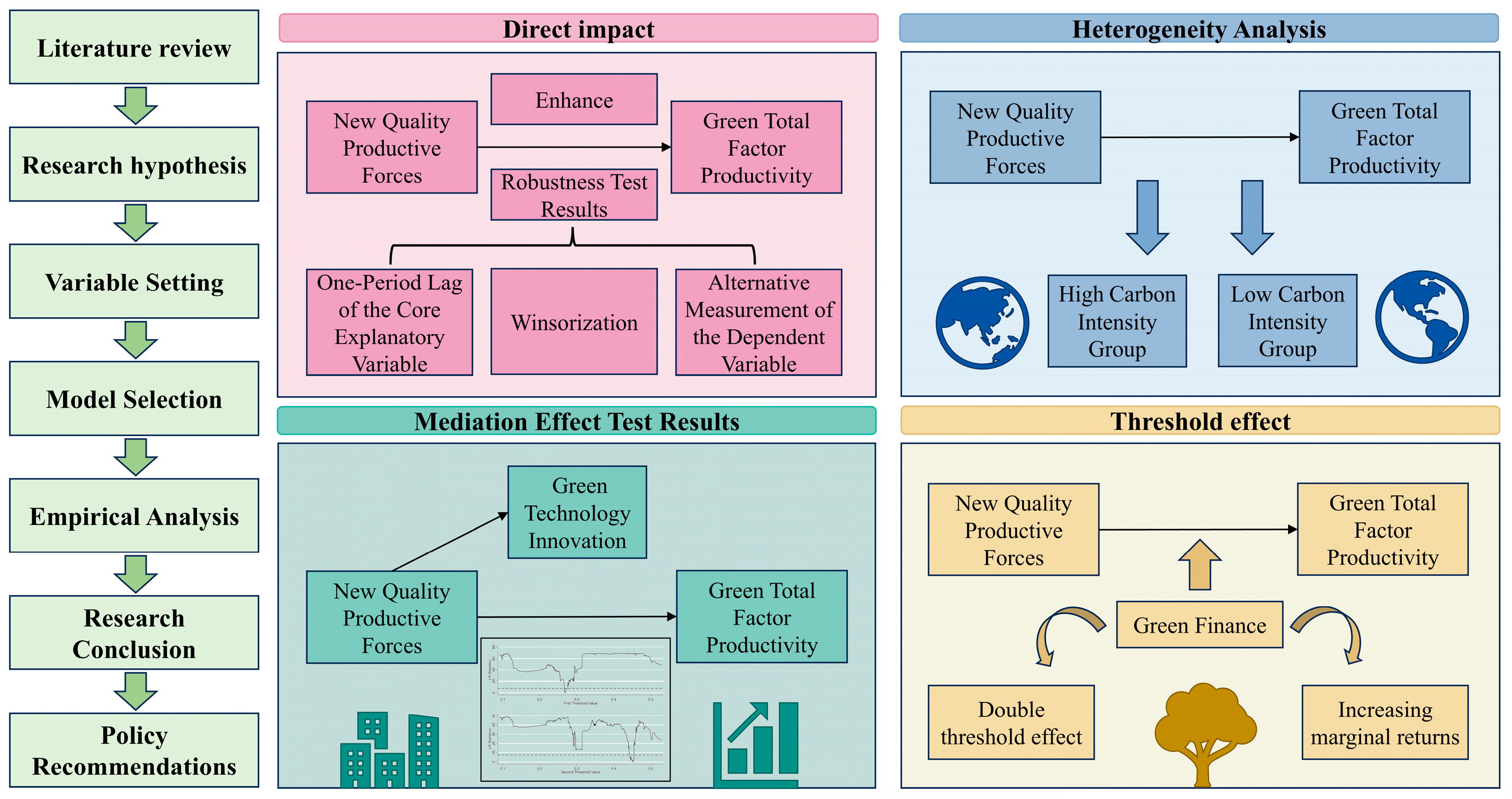 The results indicate that NQPF not only directly and robustly enhance GTFP but also exert an indirect promotional effect through the key pathway of incentivizing green technological innovation. Furthermore, the effectiveness of this promotional role significantly depends on the supportive environment provided by the regional level of GFD and exhibits a dynamic characteristic of increasing marginal effects as this level improves.