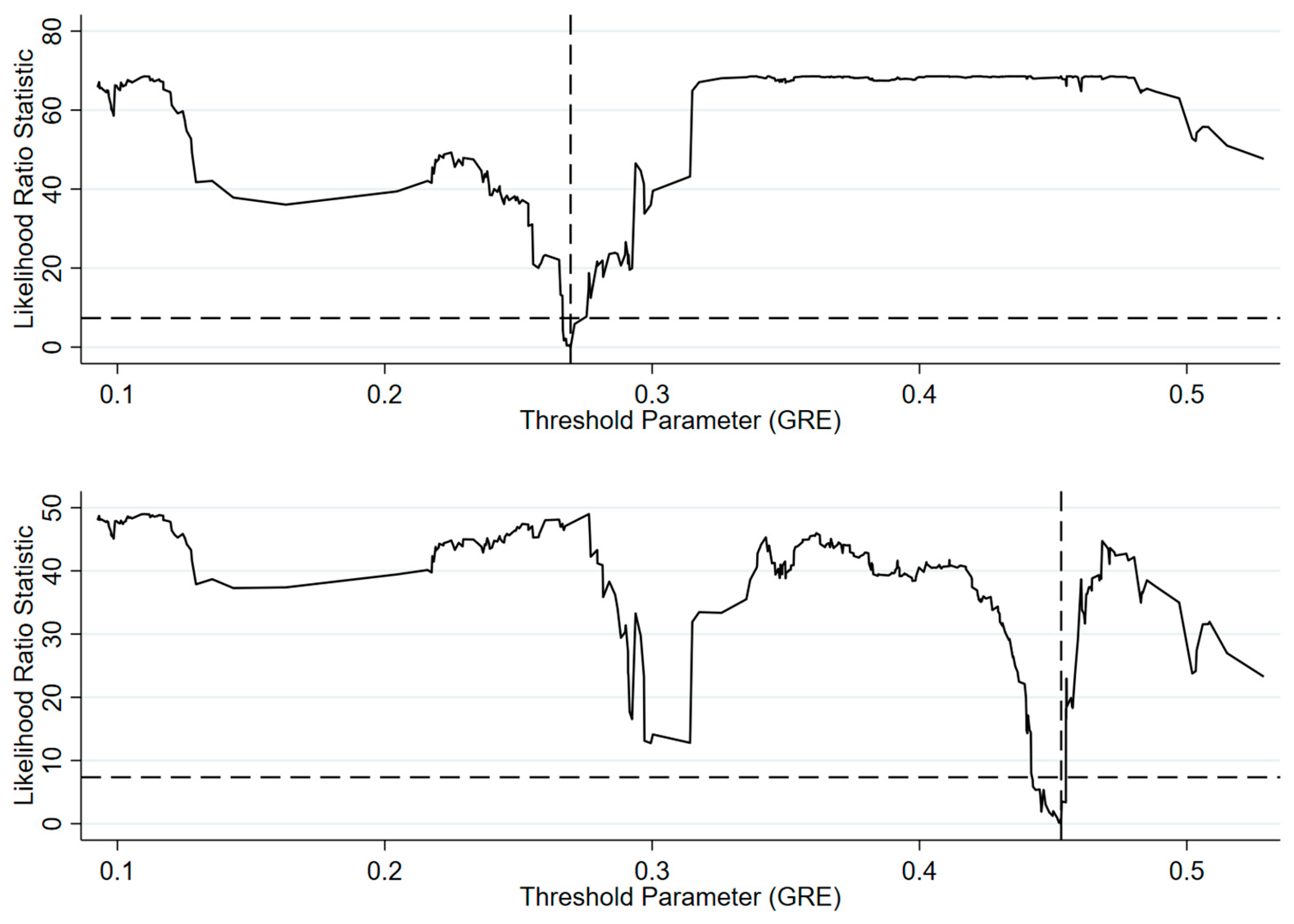 Figure 4 additionally graphs the likelihood ratio (LR) function for the dual-threshold model, with the dashed line marking the 95% confidence critical value. The outcomes reveal that the LR statistics corresponding to both threshold estimates lie beneath this critical line, affirming that the identified thresholds possess statistical significance and validity.