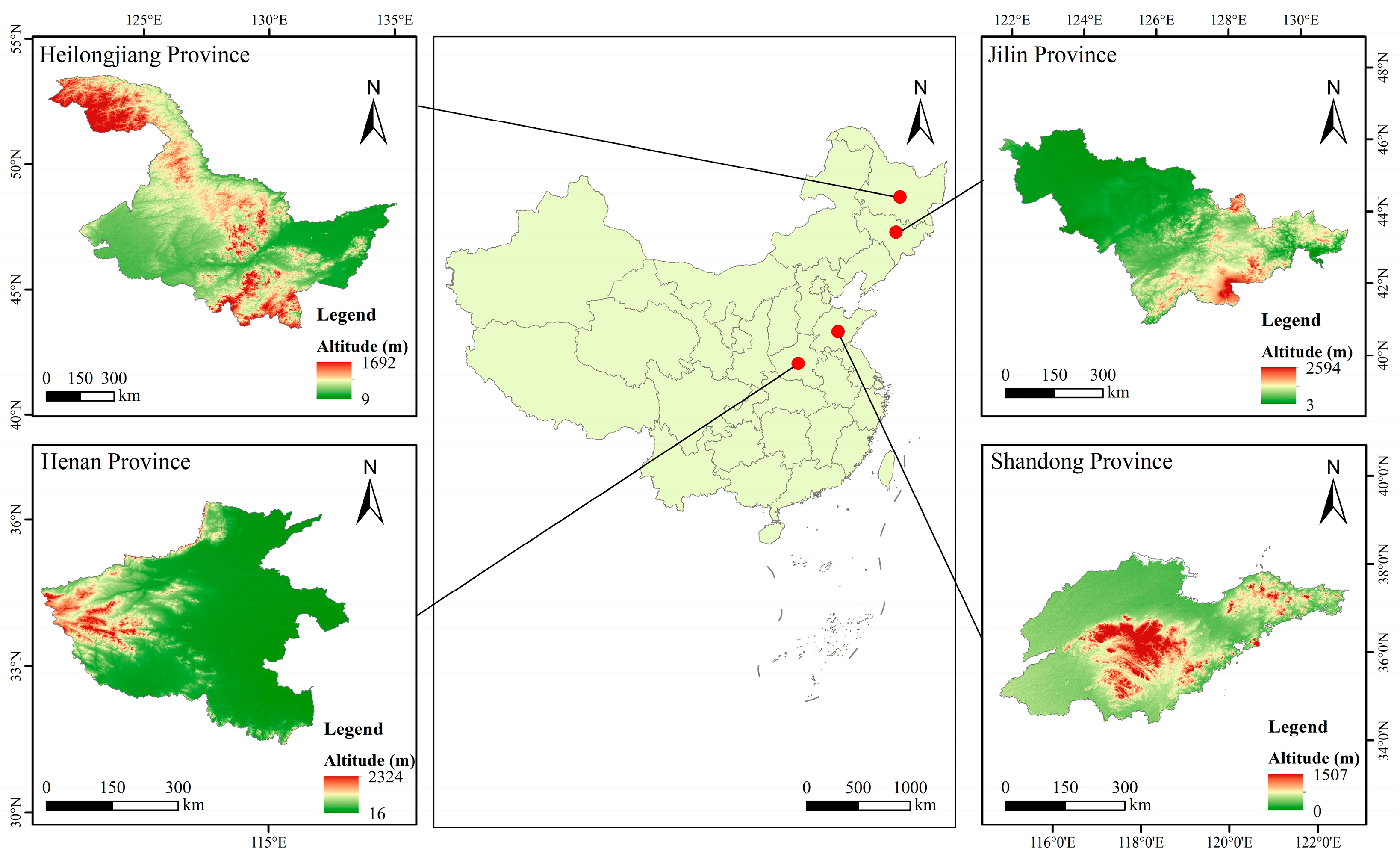 - Zhang, H.; Qin, Y.; Xu, J.; Ren, W. Analysis of the evolution characteristics and impact factors of green production efficiency of grain in China. Land 2023, 12, 852. [Google Scholar] [CrossRef]