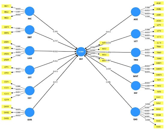 Below, Figure 1 presents the structural equation modeling results, identifying intention (INT) as the central endogenous construct. The model explains a moderate proportion of variance in intention (R2 = 0.364), indicating that socioeconomic and structural factors jointly account for 36.4% of the variation in INT. Among the antecedent variables, debt (DBT) and land ownership (LND) exhibit relatively stronger effects on intention, followed by income (INC), credit facilities (CFT), and community or social support (CST), while the influence of overall risk or external conditions (OVR) is comparatively weaker. Furthermore, INT functions as a key mediating variable linking these antecedents to outcome-related constructs, including age characteristics (AGE), literacy (LCT), training (TRN), mentoring (MNT), information access (INF), and ease of access (EAS).