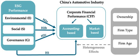 In China, the automotive industry acts as an essential driver for economic growth [7]. This industry has rapidly transformed and expanded over the past two decades, driven by technological advancements, government subsidies, and demand growth [8]. Meanwhile, Chinese automakers face increasing pressure to adopt ESG strategies not only to meet regulatory requirements and social expectations but also to maintain competitiveness in both global and domestic markets [9]. Accordingly, this dual pressure of regulatory compliance and market competition makes the automotive industry a theoretically meaningful setting to examine how ESG engagement translates into CFP. Despite the growing literature on ESG and firm performance in China’s automotive sector, several critical gaps remain. First, the existing literature rarely examines how the three ESG pillars operate through different economic mechanisms, leaving unclear why certain dimensions matter more than others for financial performance. Second, most studies rely on static correlation-based analyses and pay limited attention to how institutional conditions and firm characteristics shape heterogeneous relationships between ESG and CFP.