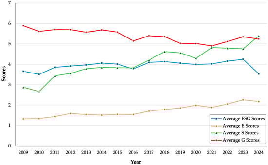 Average annual ESG scores and component scores (E, S, G) for listed Chinese automotive firms, 2009–2024.