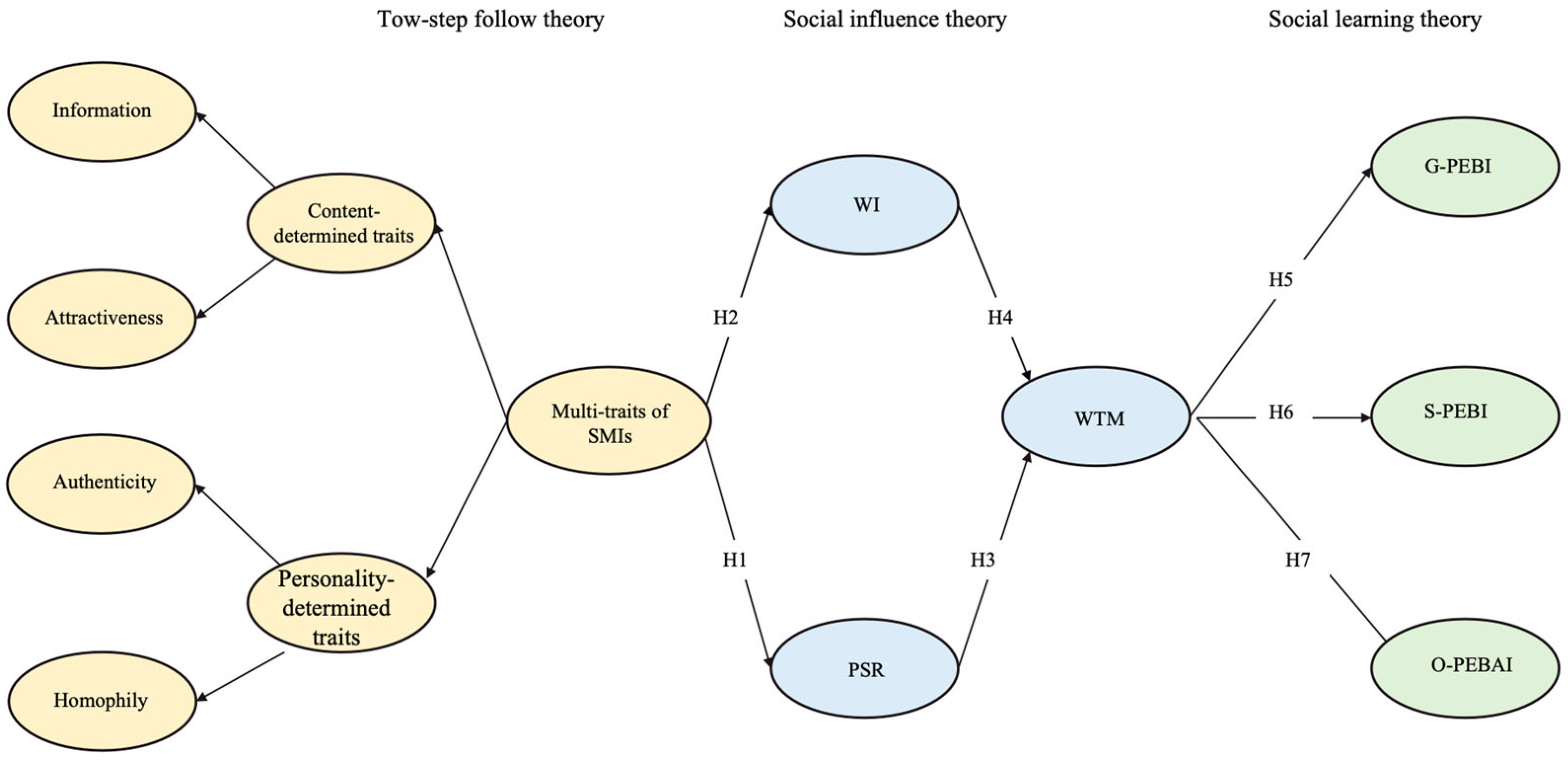 First, this study conceptualizes SMI multi-traits as a hierarchical third-order reflective construct, transcending prior approaches that treat influencer characteristics as isolated evaluative cues. By integrating content-driven dimensions (e.g., information and attractiveness) and personality-driven dimensions (e.g., authenticity and homophily), this higher-order construct captures individuals’ holistic cognitive evaluations of tourism-focused influencers rather than fragmented perceptions of discrete attributes. This conceptualization aligns with the core premises of two-step flow of communication theory and holistic impression formation theory, both of which emphasize that influencer effectiveness stems from integrated cognitive representations rather than from single attributes in isolation, these findings extend the results of previous single-trait studies [