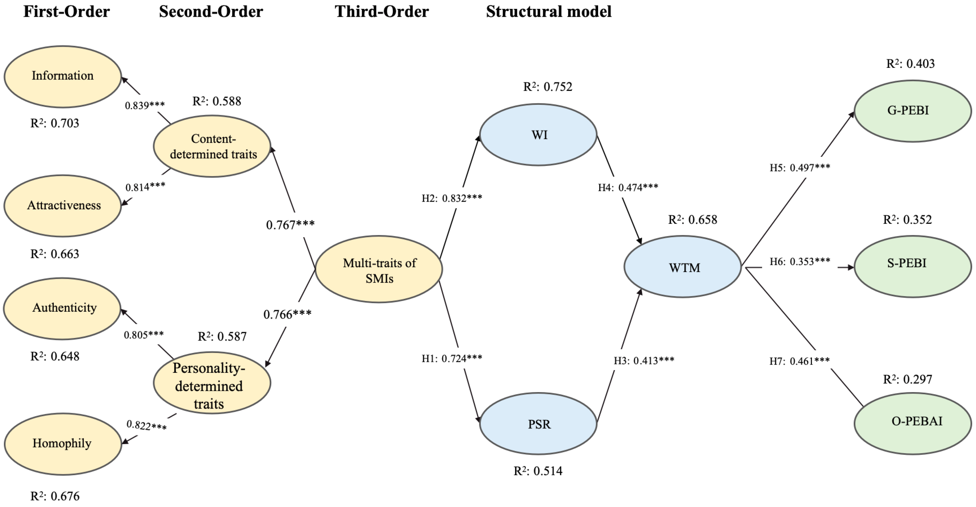 These four dimensions were hierarchically organized into two second-order factors—content-driven traits and personality-driven traits—which were further represented by a third-order latent construct capturing overall influencer multi-traits. For model identification, the path from the third-order construct to one second-order factor was fixed to unity, while all remaining paths were freely estimated.