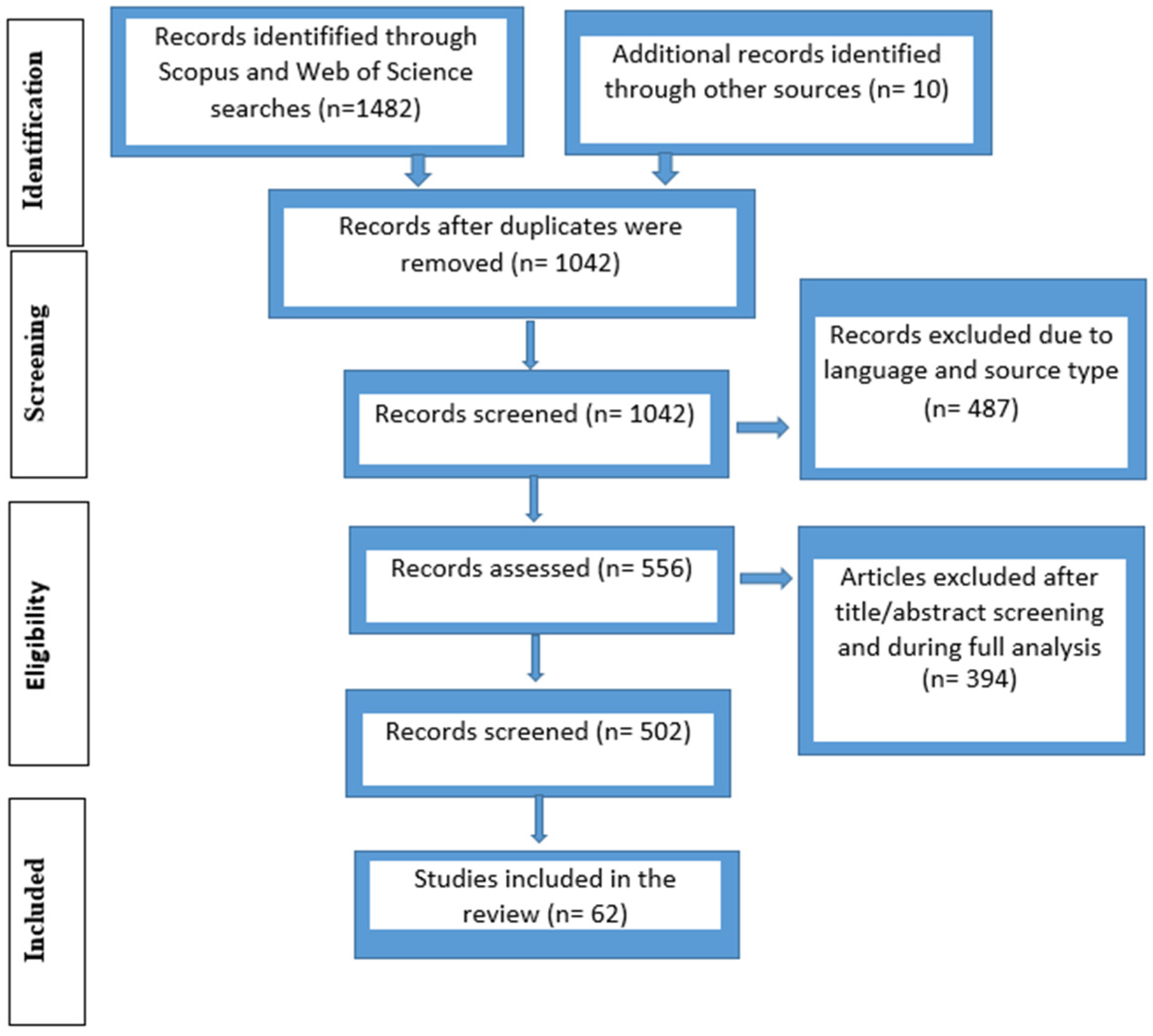 Figure 1). Of the 1655 initial records, 612 were removed due to duplication. The remaining 1043 records underwent title and abstract screening, during which 487 studies were excluded for not fitting the scope of the research. Subsequently, 556 studies were read in full, resulting in the exclusion of 394 due to methodological limitations or thematic misalignment. In the end, 62 studies formed the basis of the review, a diverse and consistent body of evidence capable of providing a broad understanding of the state of the art on the subject.
