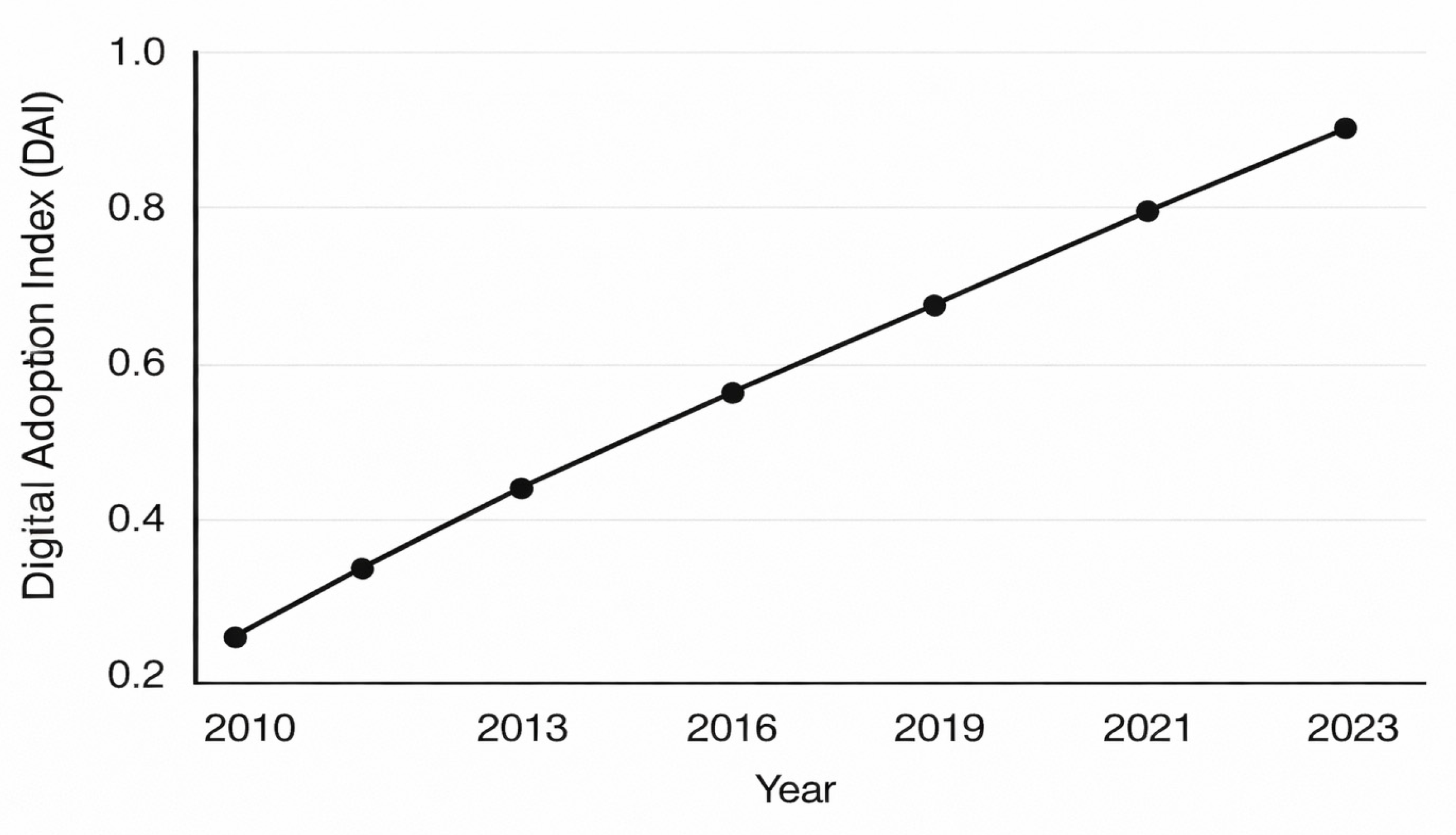 Figure 1, which outlines the Digital Adoption Index (DAI) development across 32 emerging economies in the world from 2010 to 2023 [