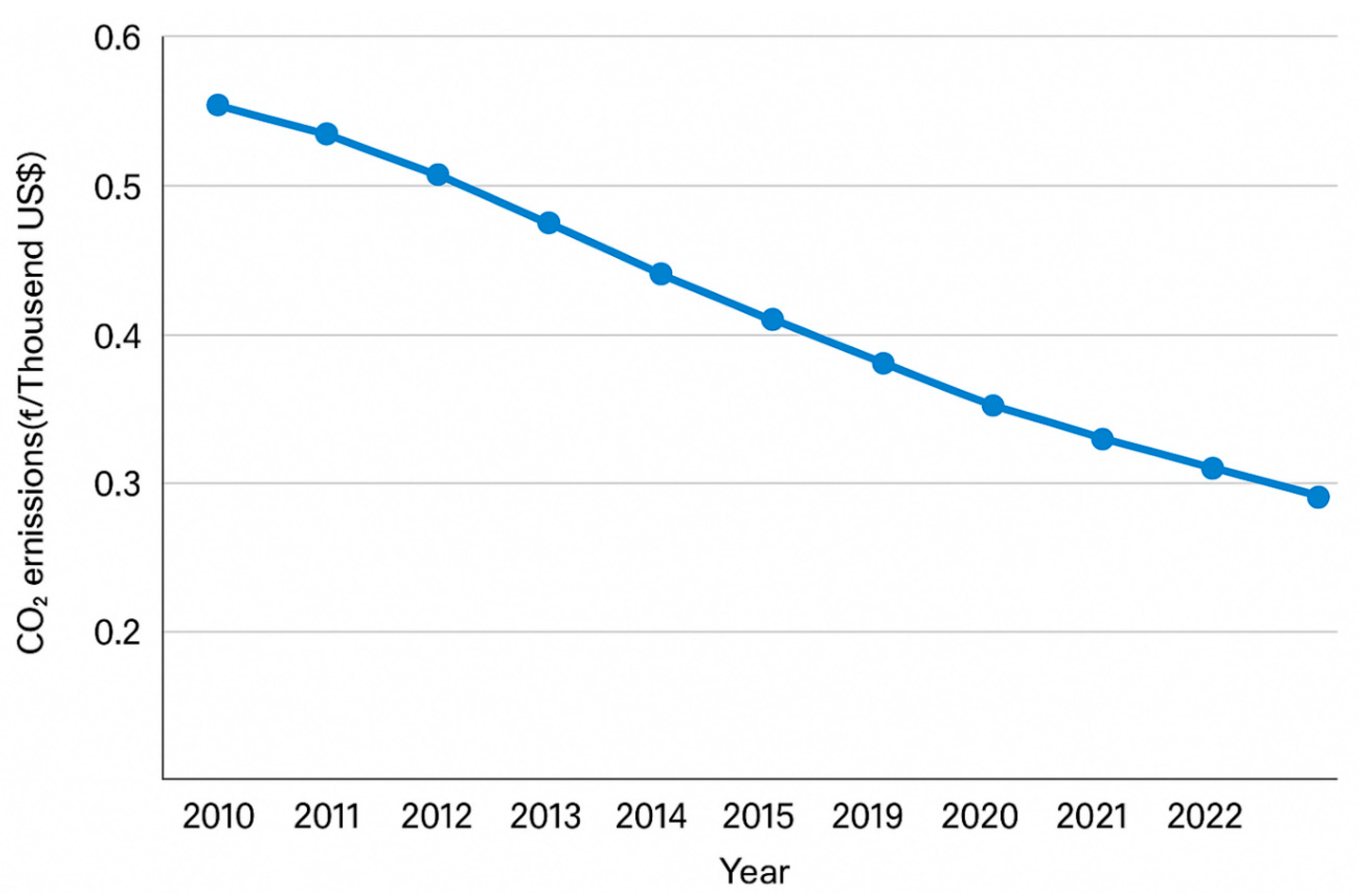 2) emissions per GDP unit throughout the period 2010–2023 and indicates the separation of economic growth from emissions in various areas, as well as the persistence of difficulties for developing economies. The statistics denote a slow but steady worldwide drop in carbon intensity, which is the result of enhanced energy efficiency, the use of renewable energy, and changes in the structure of the economy, among the main reasons [