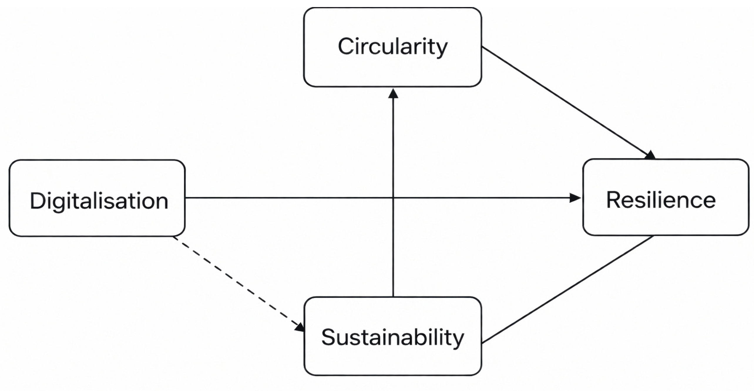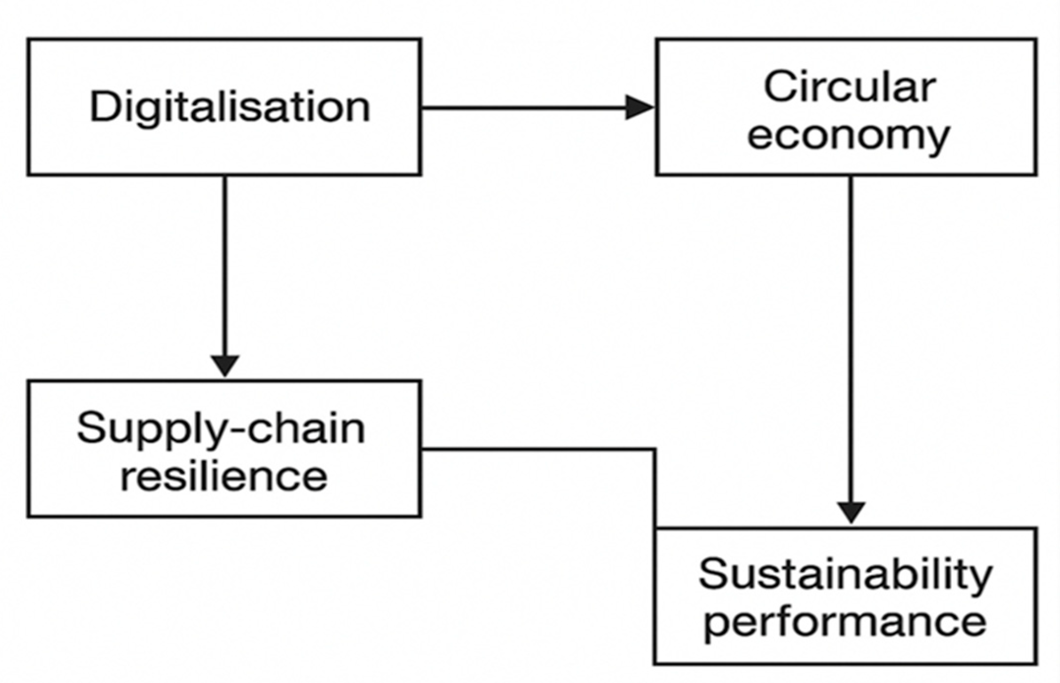 32]. Based on this, the conceptual framework specifies a series of relationships where there are direct, indirect, and sequential relationships. First, digitalisation is posited to have a direct, positive effect on adopting circular-economy practices, as digital technologies provide the information content and technological systems that support circularity strategies. Second, digitalisation is anticipated to have a direct effect of strengthening resilience by providing predictive analytics to supply chains, while also enhancing transparency and coordination in supply chain operations. Third, circularity is expected to have a direct effect on resilience by reducing dependency on primary resource flows, while also reducing vulnerabilities related to material disruptions. Fourth, resilience is expected to have a direct effect on environmental sustainability performance by providing stabilisation in production systems, enabling the supply chain to consistently move toward environmental targets. Together, these direct pathways form the structural foundation of the model [