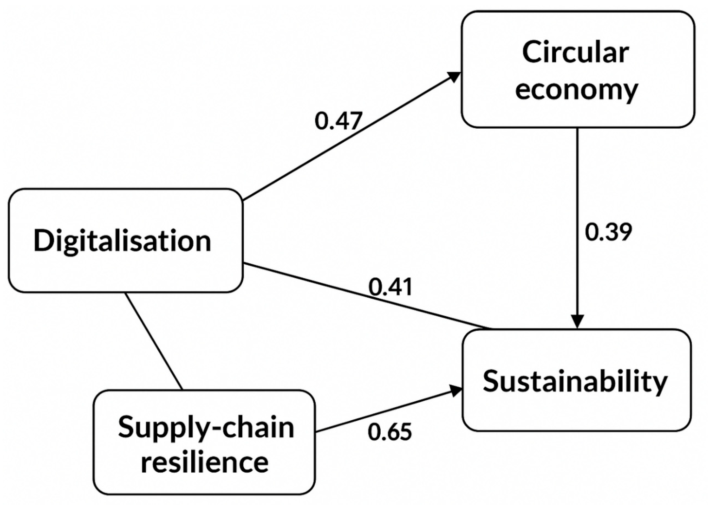 Section 3. Digitalisation significantly enhances circular-economy adoption (H1) and directly strengthens supply chain resilience (H2). Circular-economy practices exert a positive and statistically stronger influence on resilience (H3), while resilience itself emerges as a robust predictor of sustainability performance (H4). Mediation analysis confirms that circularity partially mediates the digitalisation–resilience relationship (H5), and the serial mediation results validate the proposed pathway through which digitalisation affects sustainability via circularity and resilience (H6). Together, these results empirically substantiate the study’s integrated capability-based framework. The results of this research validate that digitalisation, circularity, and resilience are an interconnected capability system that significantly influences sustainability outcomes in emerging economies [