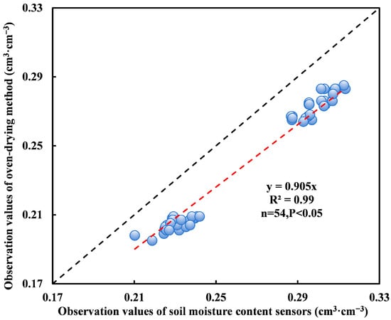 Soil moisture content was quantified using two complementary approaches, i.e., the oven-drying method or soil moisture sensor monitoring. The oven-drying method yields high-precision results but is inherently time-consuming and labor-intensive, making it unsuitable for high-frequency daily measurements. In contrast, sensor-based monitoring offers the advantages of efficiency and labor savings, albeit with potential minor accuracy deviations. In this study, soil moisture sensors were deployed for real-time continuous monitoring, while periodic soil samples were collected and analyzed via the oven-drying method to establish a calibration correlation between the two methods. Statistical analysis confirmed a significant linear relationship with sensor-derived and oven-drying measurements, with sensor-derived sensor readings averaging 9.5% lower results than the oven-drying measurements (Figure 1). The raw sensor data were then calibrated using the fitted linear equation to ensure data accuracy for subsequent analyses.