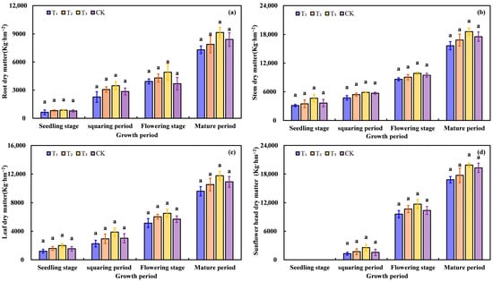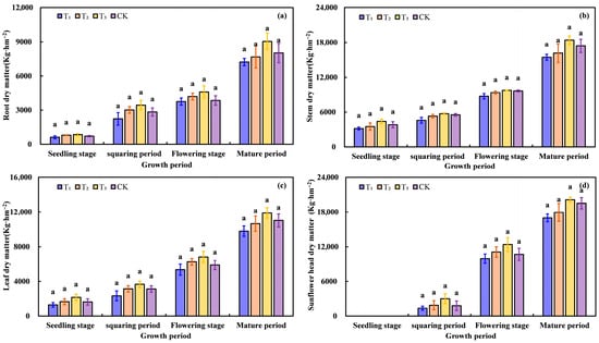 Sunflower organ dry matter mass in 2024. (a) Root; (b) stem; (c) leaf; (d) flower head. The letters denote the significance of differences among treatments at the p = 0.05 probability level.