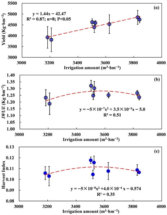 Relationship between irrigation water and sunflower yield, water productivity, and harvest index. (a) Yield; (b) water productivity; (c) harvest index.