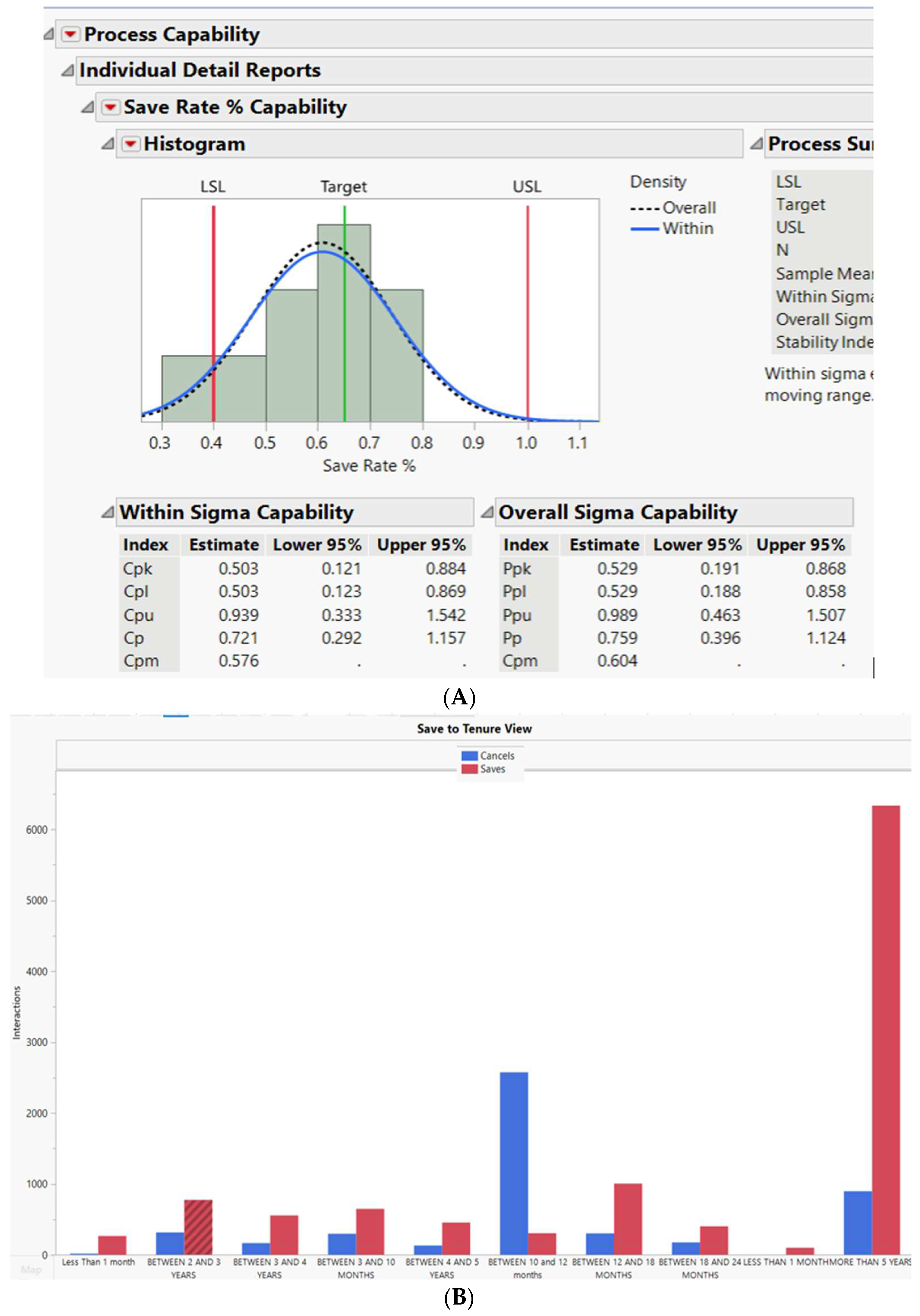 | Process Performance Metrics | Save rate, tenure, cancellation rates | Historical and pilot | Population-level | Capability analysis and pilot verification |