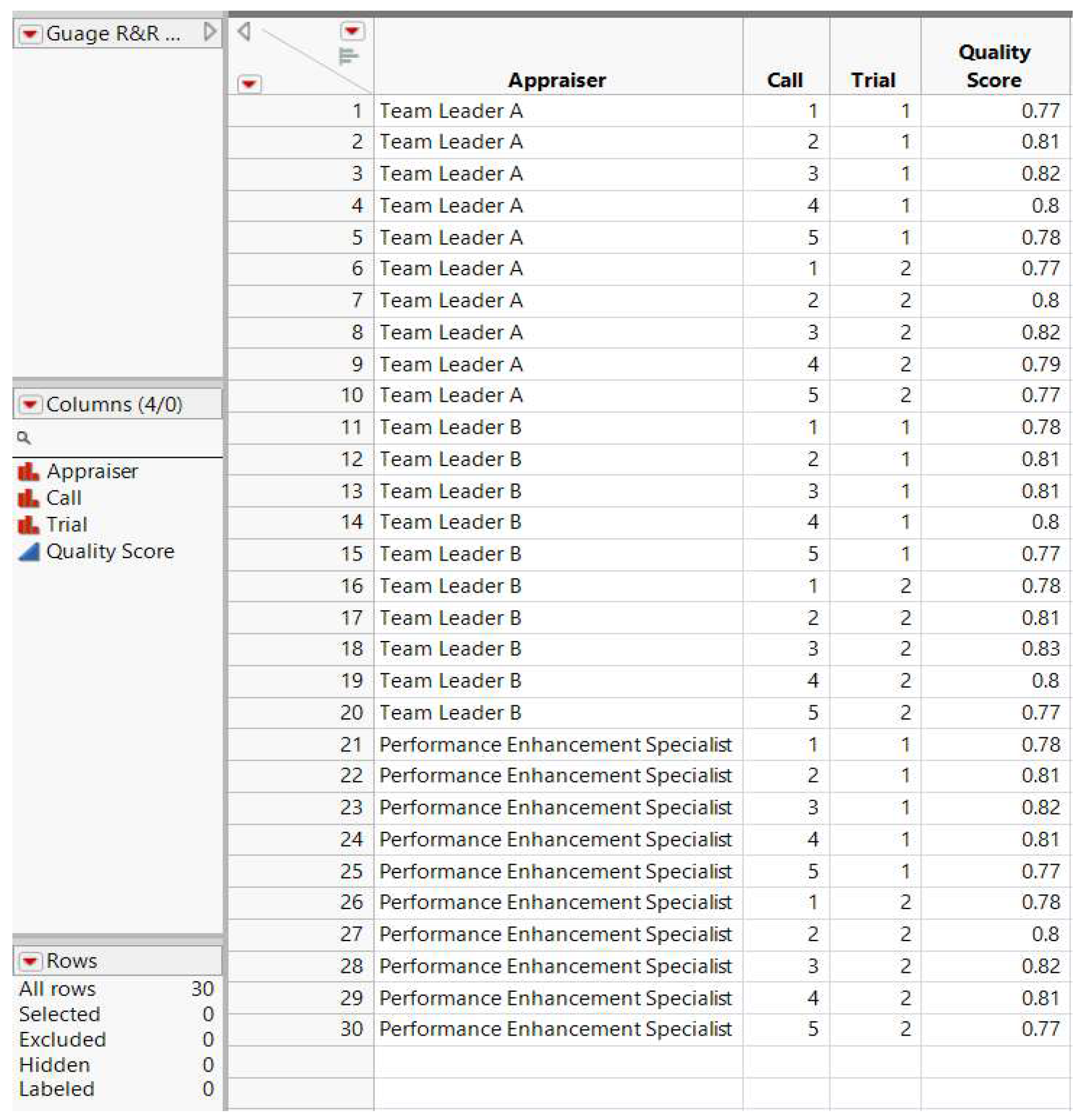 | Objective | Identify coaching factors impacting call quality and save rate % | Assess repeatability and reproducibility of call scoring |