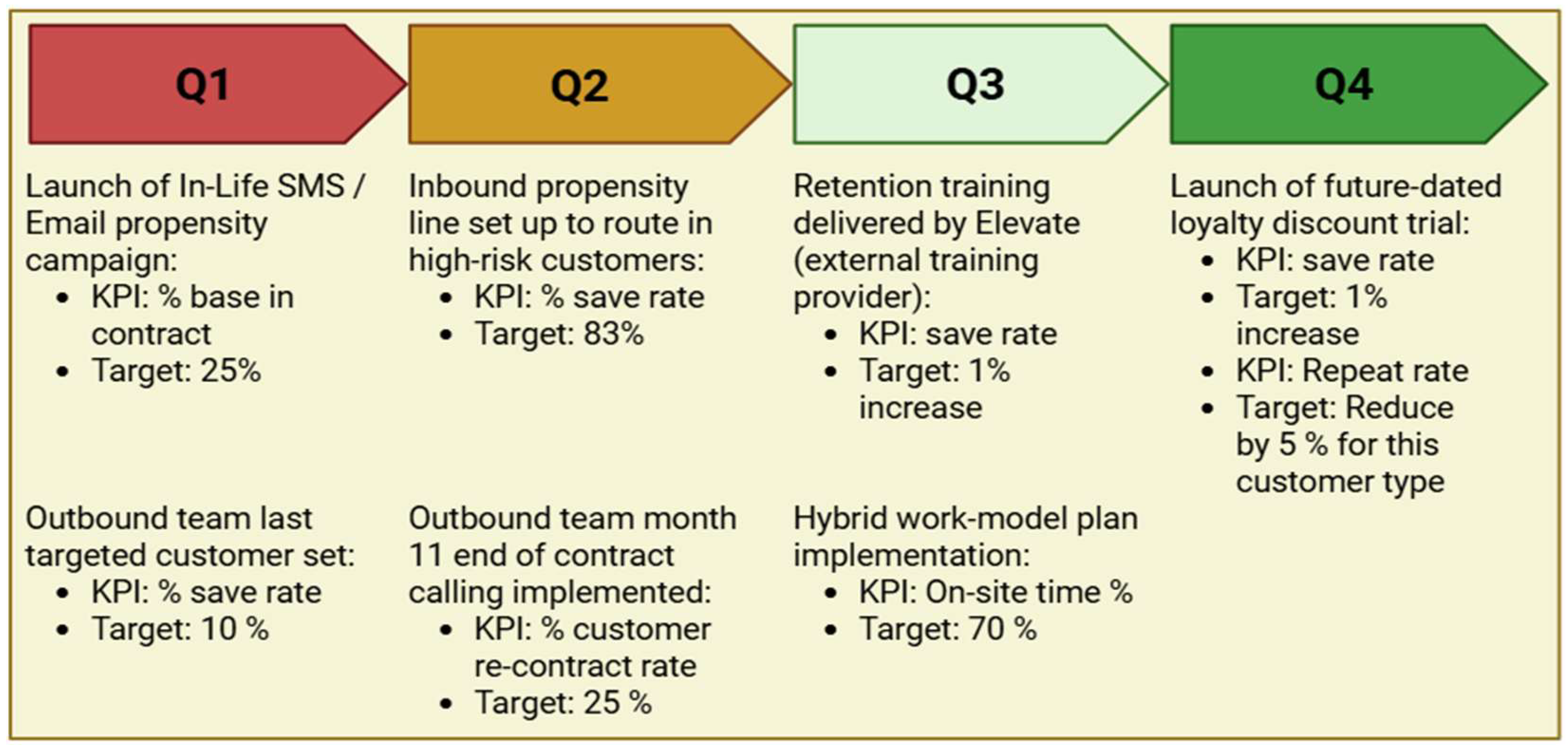 | 4 | For agents >6 months tenure, move to a model with >75% of time spent onsite. | Senior Operations Managers | 01-Feb |