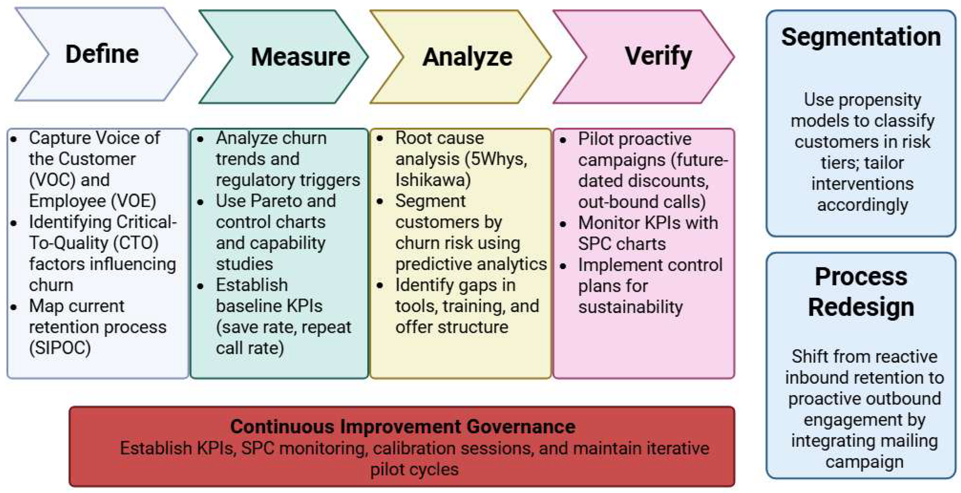 Chicago/Turabian StyleMulcahy, Enda, Rachel Moran, Patrick Walsh, and Anna Trubetskaya. 2026. "Creating a Proactive Churn Retention Strategy in a Telecommunications Company Through the Application of Design for Lean Six Sigma" Sustainability 18, no. 3: 1400. https://doi.org/10.3390/su18031400