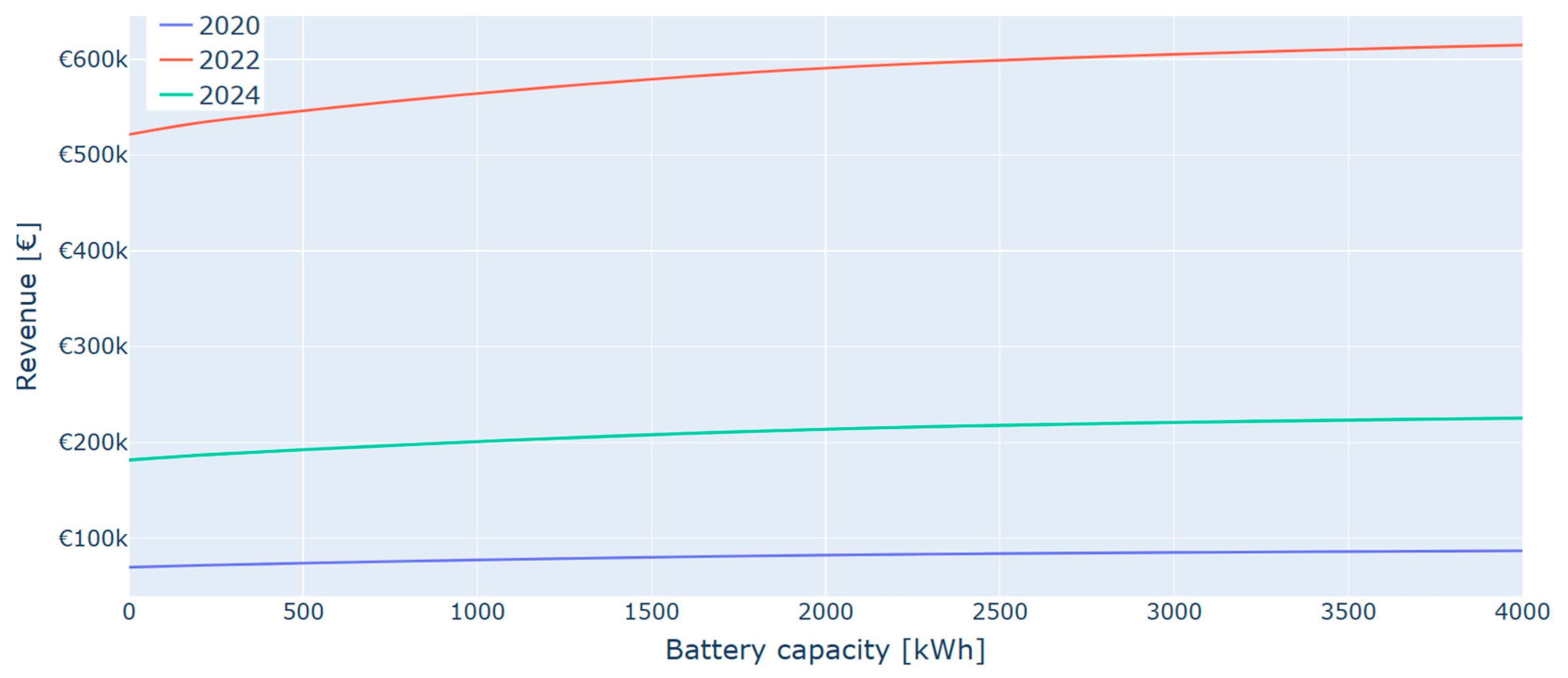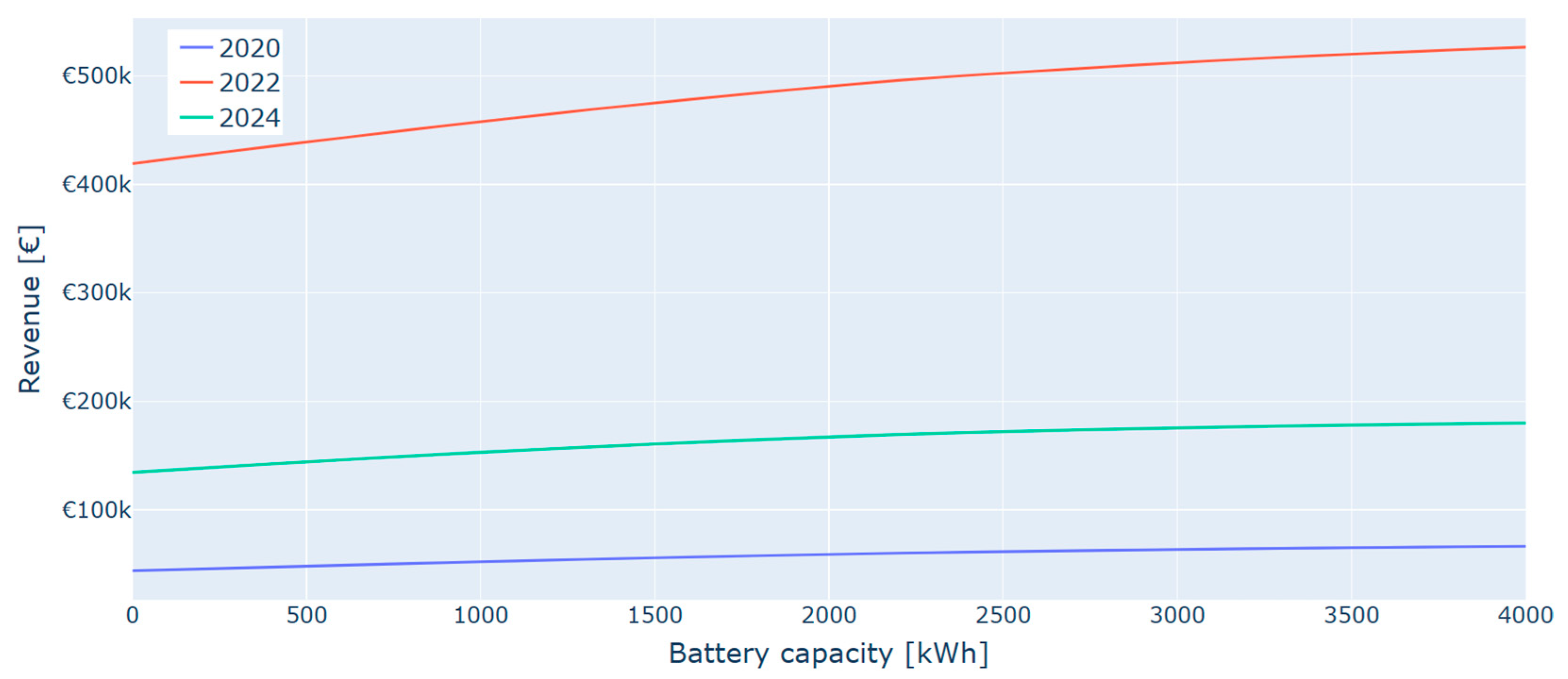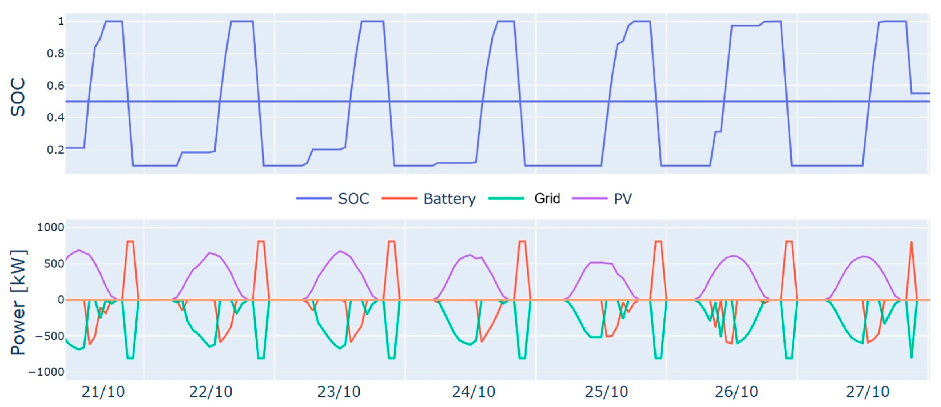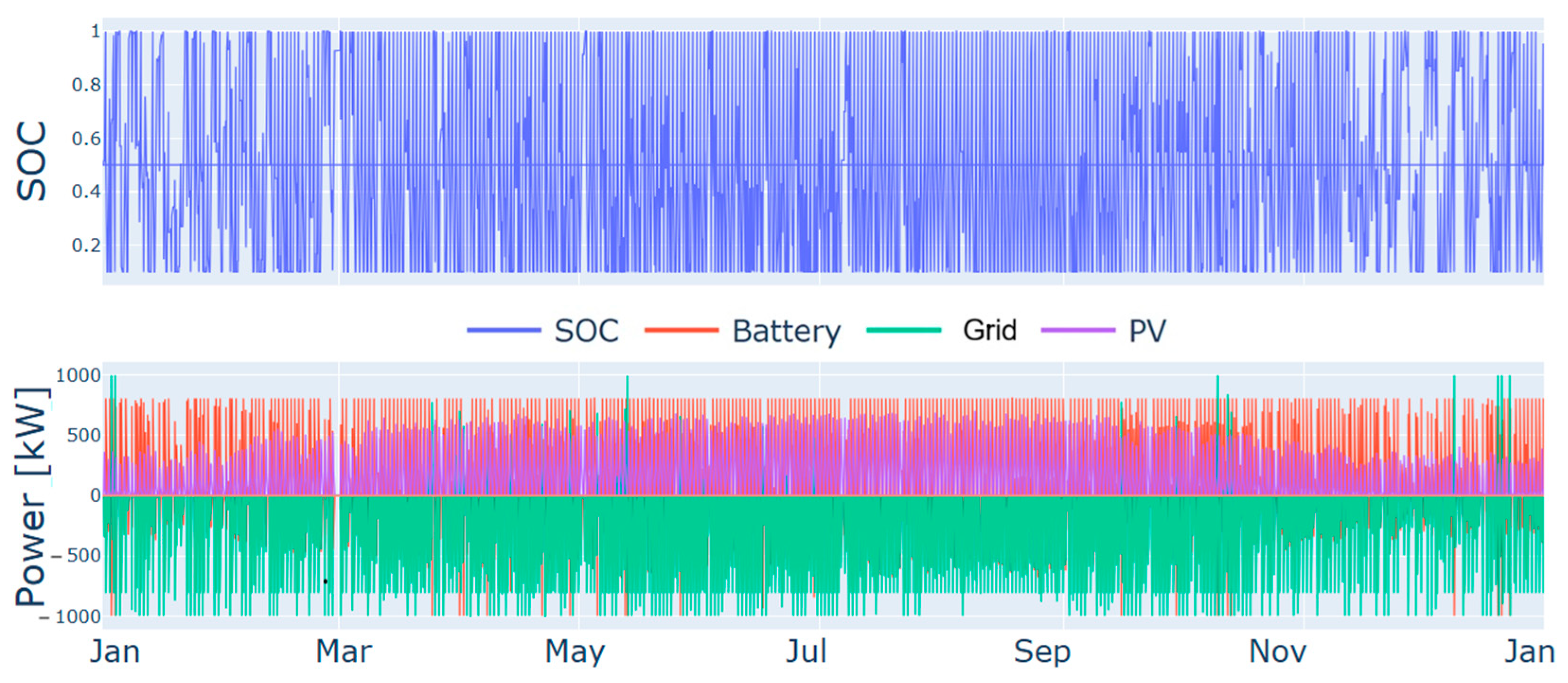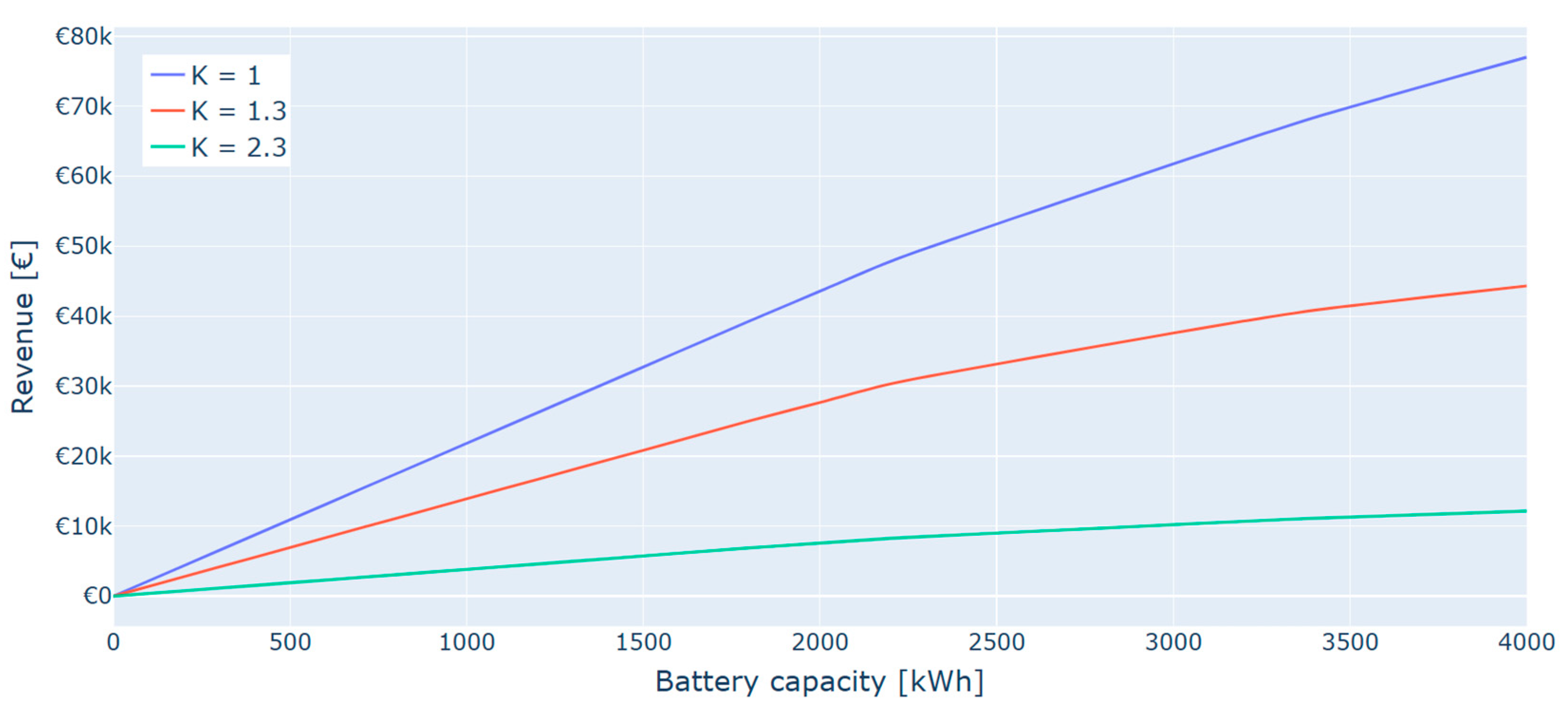 | Δt = 1 h | BESS C-rate_max = 0.5, = 0.9 | (K = 2.3) | OpEx = 2 kEUR/MWh |