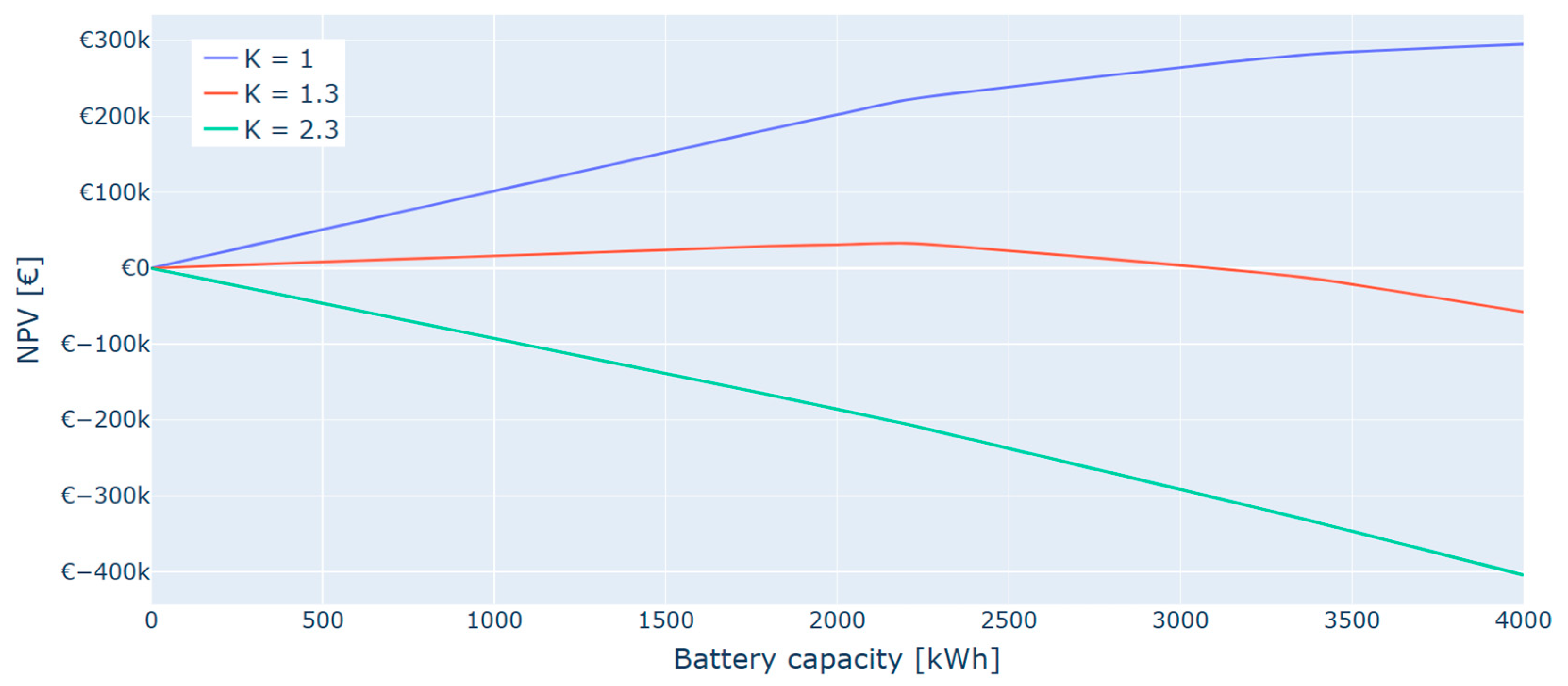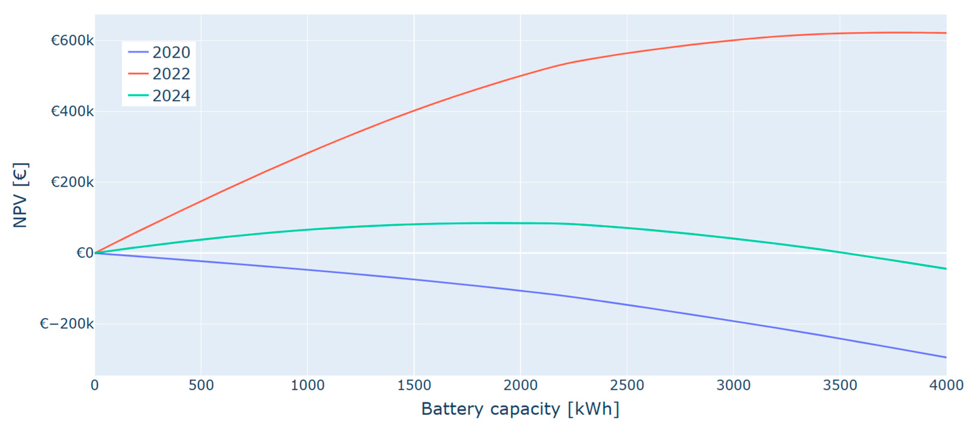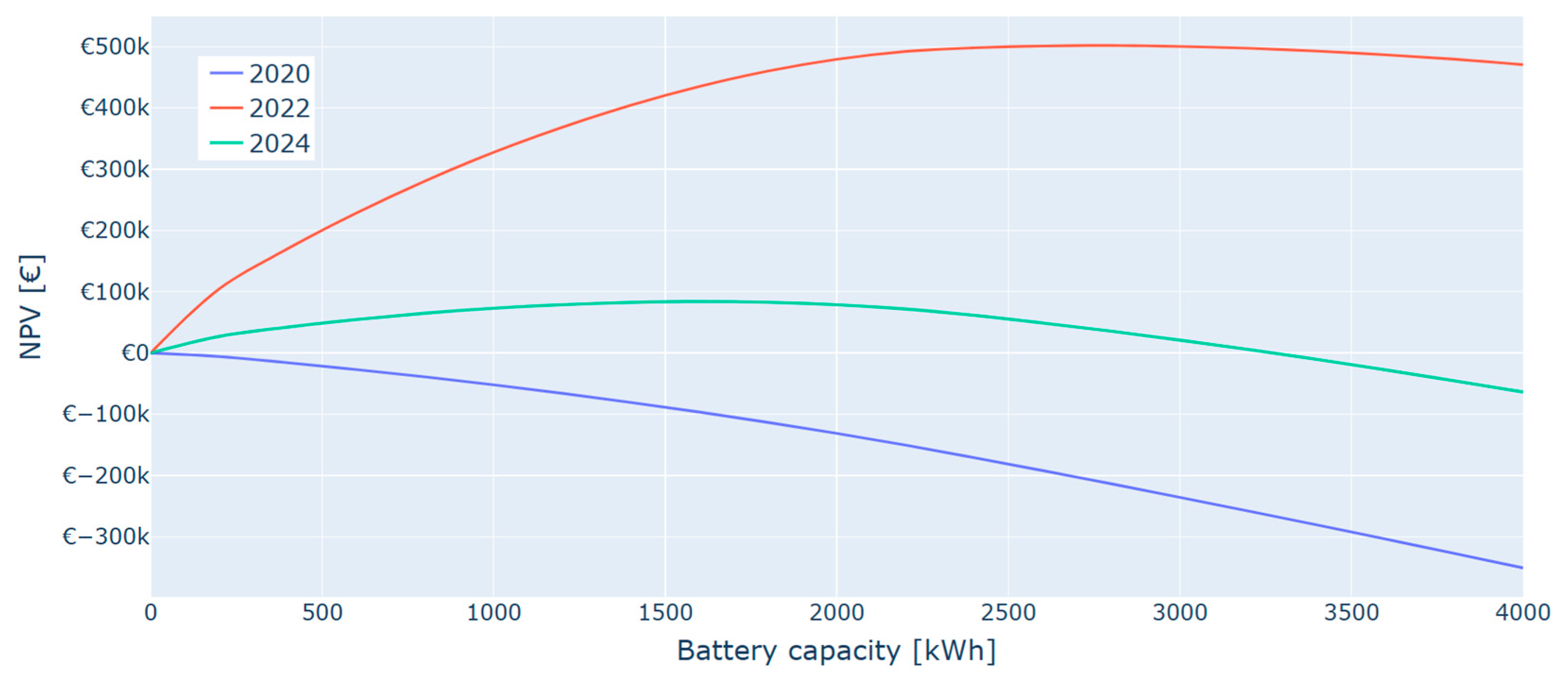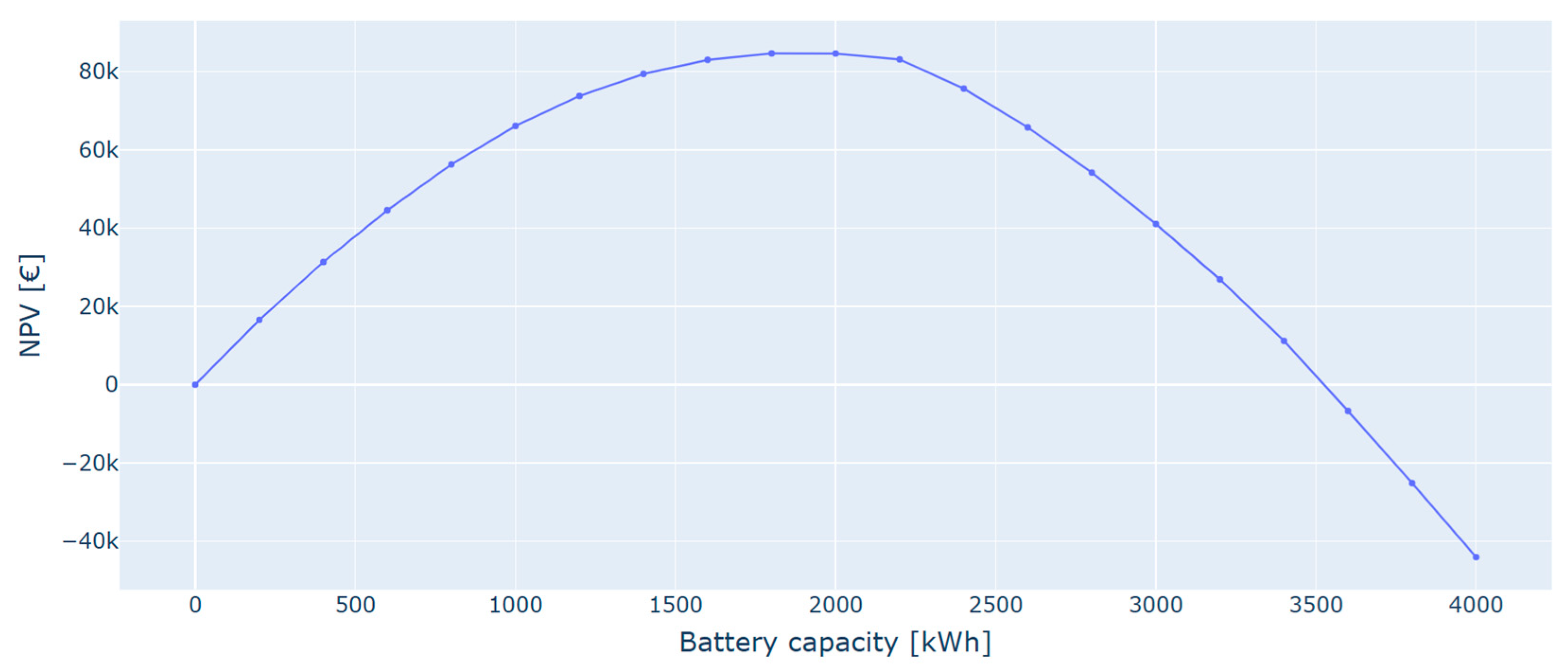 | CapEx (kEUR/MWh) | NPV (kEUR) | Capacity (MWh) | CapEx (kEUR/MWh) | NPV (kEUR) | Capacity (MWh) |