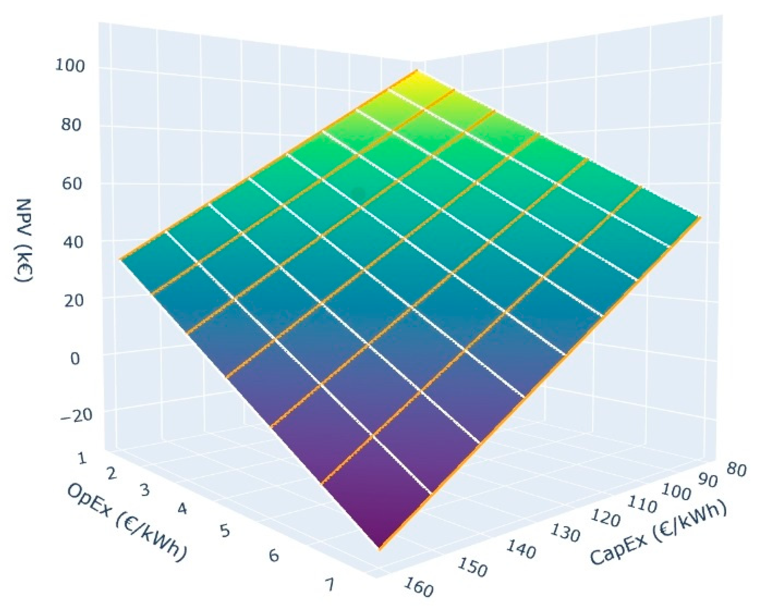 | OpEx (kEUR/MWh) | NPV (kEUR) | Capacity (MWh) | OpEx (kEUR/MWh) | NPV (kEUR) | Capacity (MWh) |