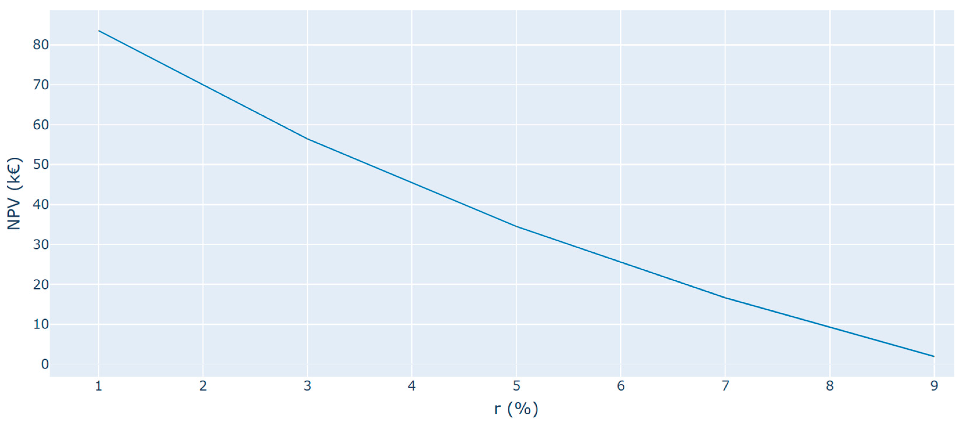| Discount Rate r (%) | NPV (kEUR) | Capacity (MWh) | Discount Rate r (%) | NPV (kEUR) | Capacity (MWh) |