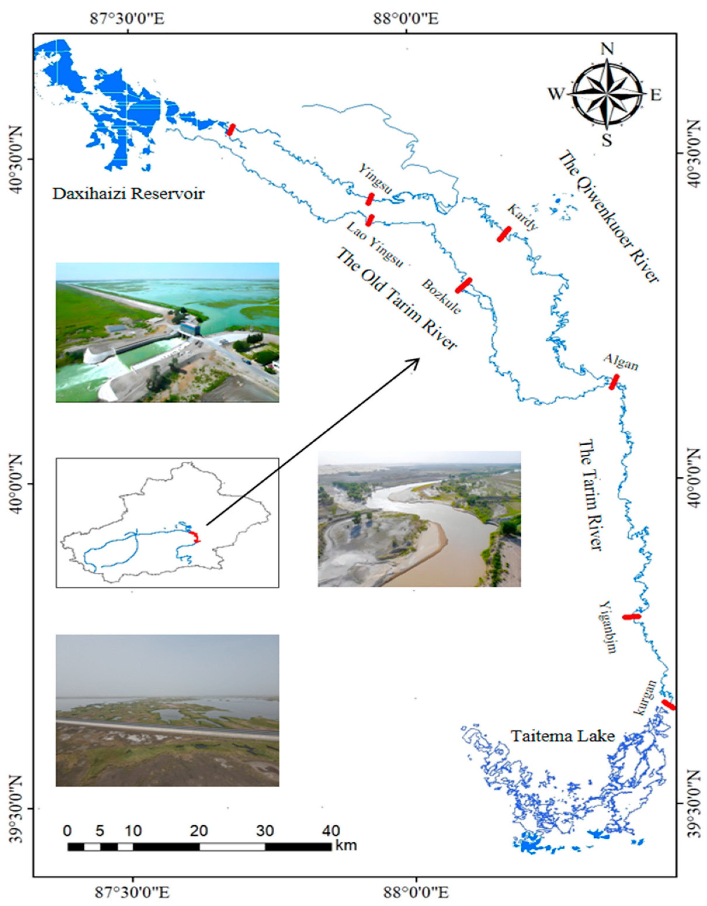 - Wickert, A.D.; Brook, G.A.; Bordonali, C.; Shen, J.; Zhang, Y.; Cai, Y. Desiccation of the Tarim River, Xinjiang, China, and Mitigation. Quat. Int. 2011, 244, 264–271. [Google Scholar] [CrossRef]