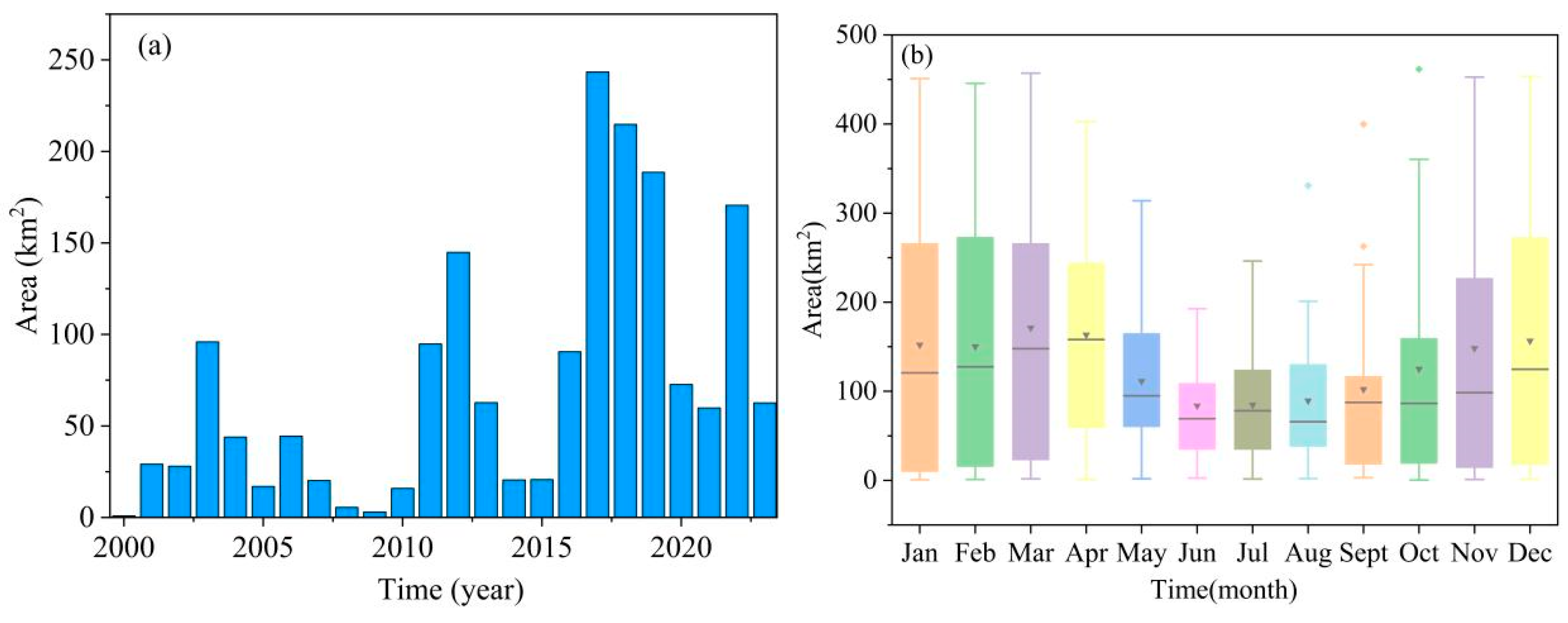 3.1. Spatio-Temporal Variation Characteristics of the Surface of Taitema Lake