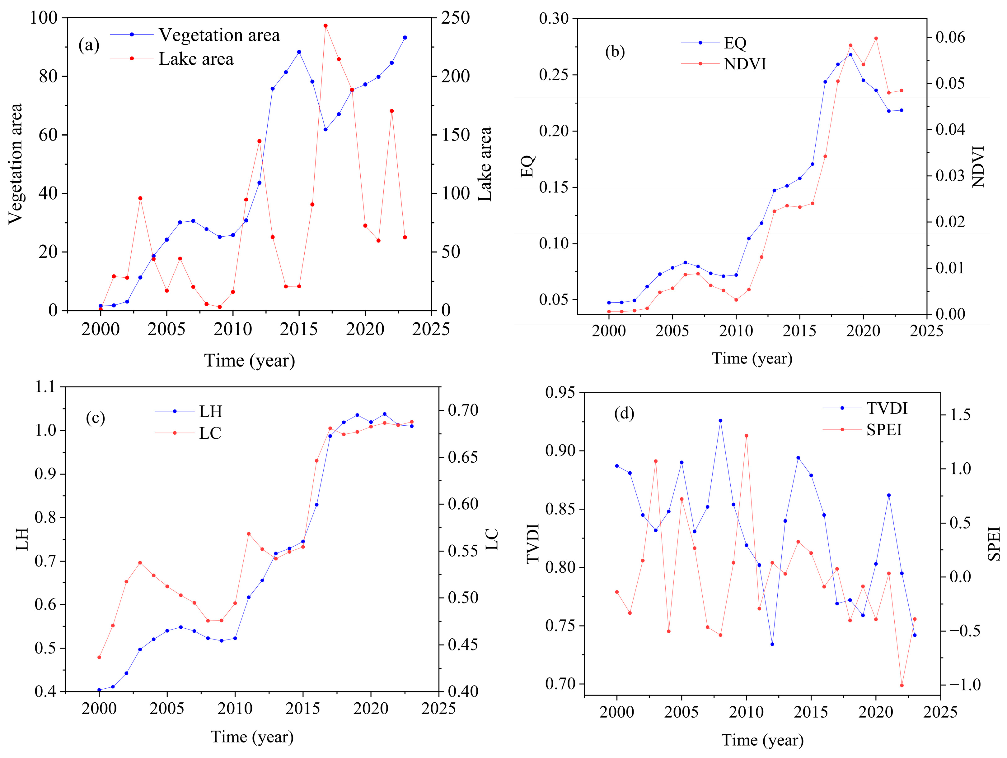 | LA | Characterizes the annual surface area of effective lake water bodies. | On the Google Earth Engine platform, the JRC Global Surface Water dataset is used. A pixel is classified as water if it is identified as water in ≥7 months within a given year, and the annual lake area is obtained by summing all such water pixels [23]. |