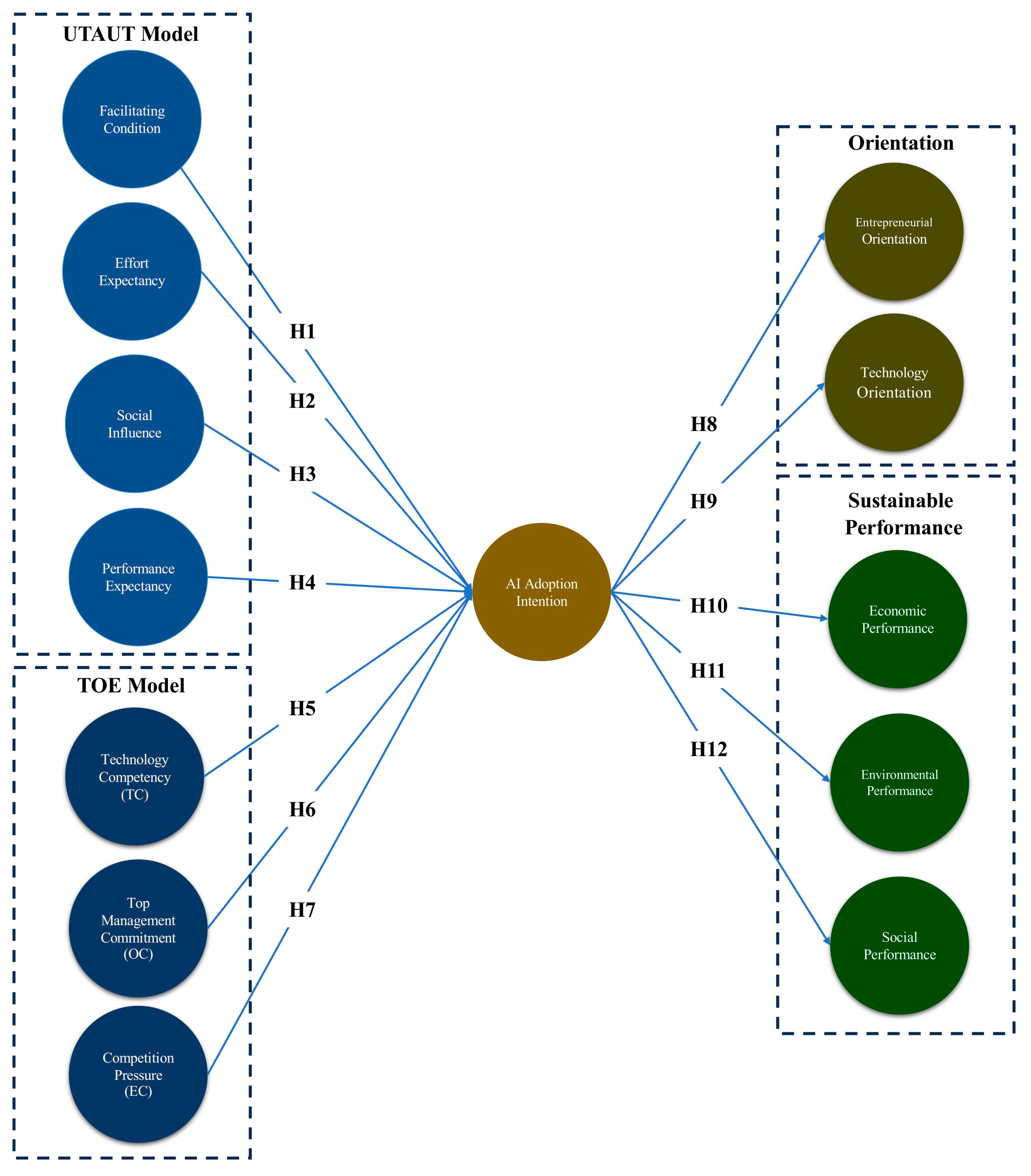 - Jamil, K.; Zhang, W.; Anwar, A.; Mustafa, S. Exploring the Influence of AI Adoption and Technological Readiness on Sustainable Performance in Pakistani Export Sector Manufacturing Small and Medium-Sized Enterprises. Sustainability 2025, 17, 3599. [Google Scholar] [CrossRef]