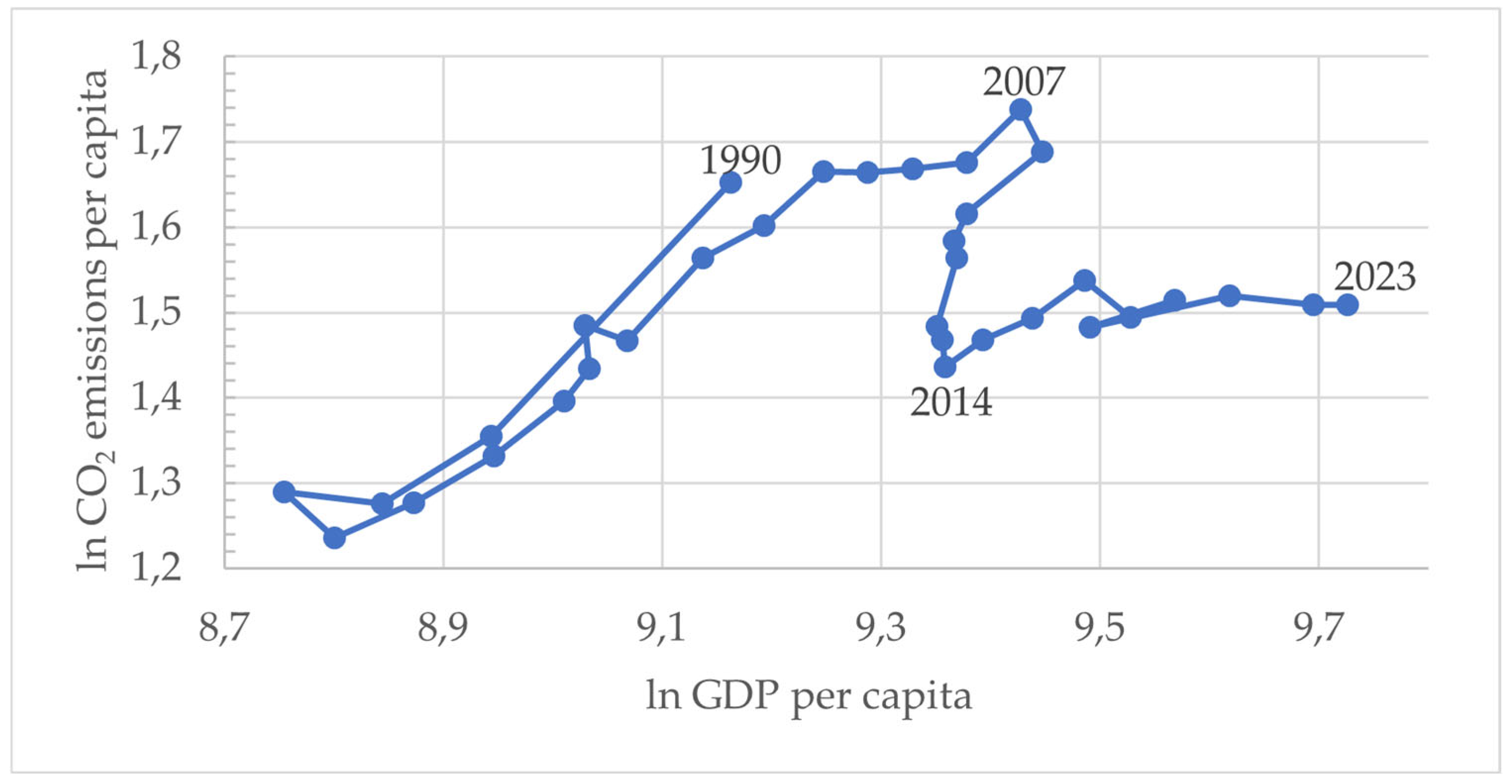 2 emissions. The peak was reached in 2007, after which there was a gradual decline and stabilization of emissions despite further GDP growth. This trend suggests a potential inverted U-shaped relationship between economic development and environmental degradation, providing partial support for the EKC hypothesis, according to which pollution levels rise at the early stages of economic growth but begin to decrease once a certain income threshold (turning point) is reached.