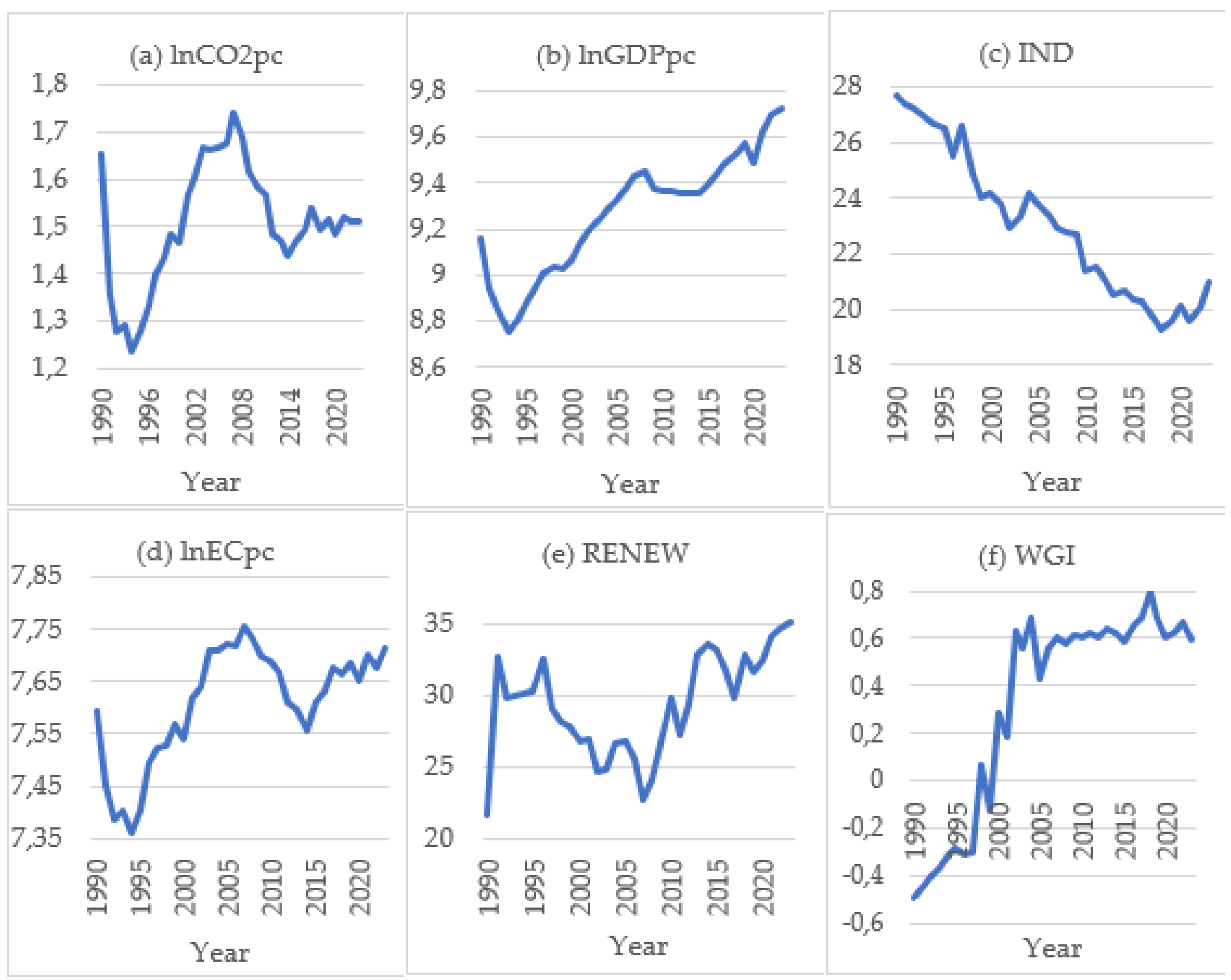 Figure 2) reveals distinct trends among the main variables over the period 1990–2023. Several of them, such as lnGDPpc, IND and WGI, show fairly clear upward or downward movements over time, which already hints that these series might not be stationary in their original levels. In contrast, the patterns for lnCO