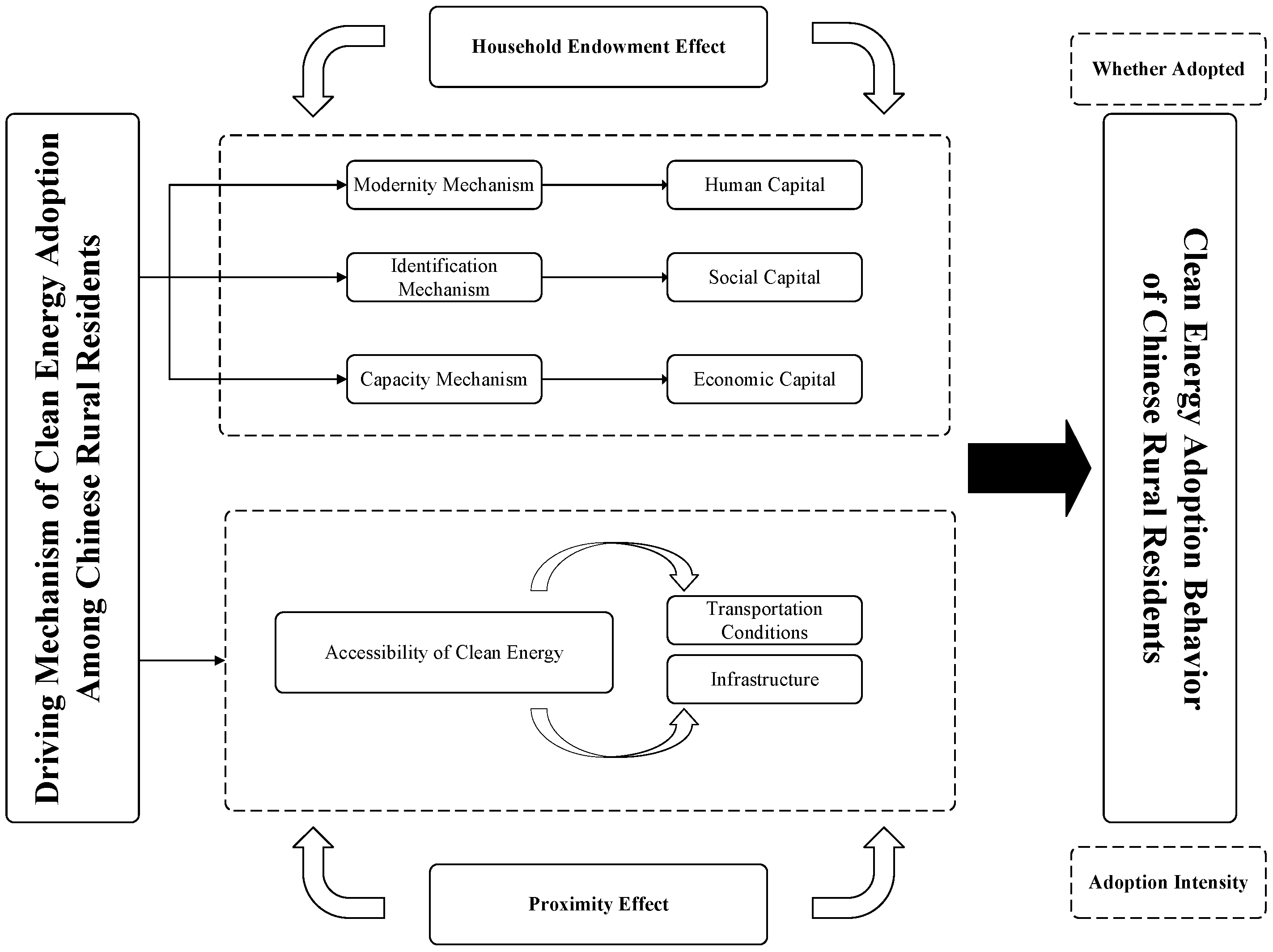 Figure 1 summarizes the theoretical framework of driving mechanisms for rural residents’ clean energy adoption.