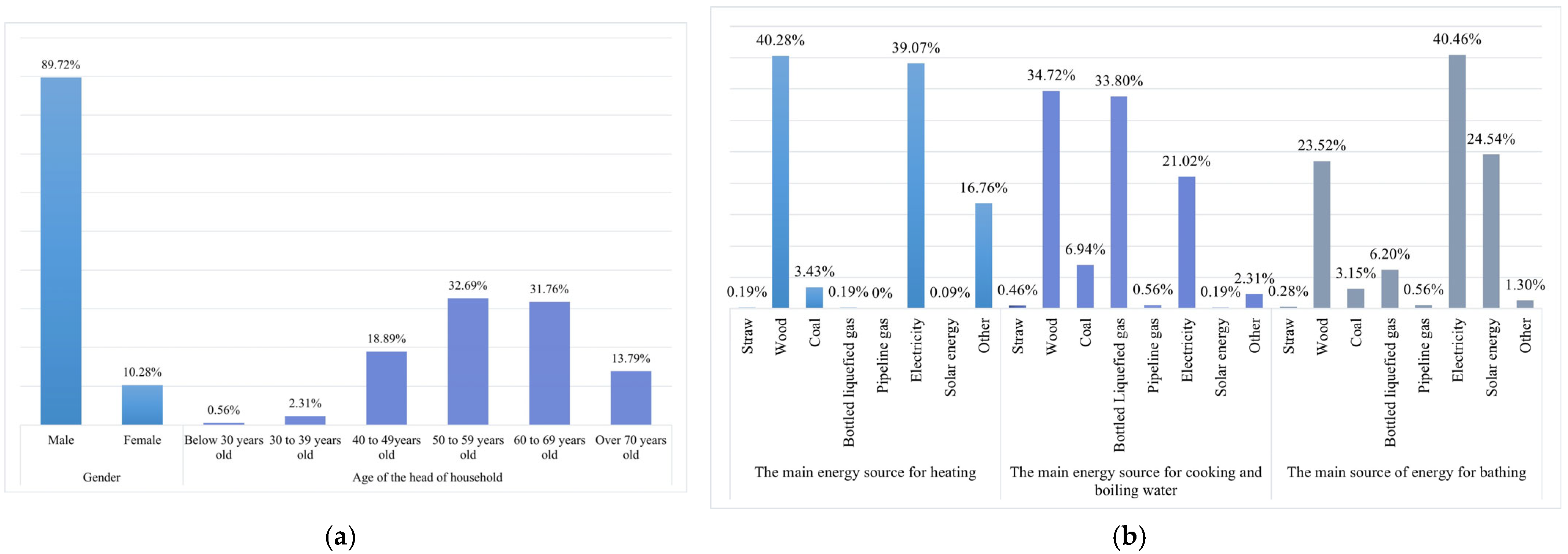 - Li, L.; Xia, H.; Chen, Z.; Duan, M.; Pei, J. Spatiotemporal characteristics and driving mechanisms of household energy transition in rural China: Micro-evidence from 2005 to 2017. Sci. Total Environ. 2024, 909, 168554. [Google Scholar] [CrossRef]