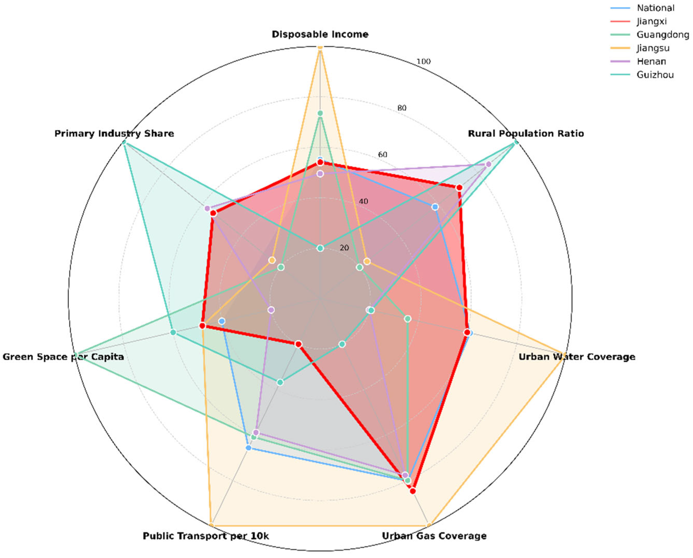 It is important to note that Jiangxi Province was selected as the analytical sample not only because of data availability, but also because it serves as a typical and representative case in China’s rural energy transition. To systematically assess its representativeness, this study compares Jiangxi with the national average and with several representative provinces, including Guangdong and Jiangsu (economically developed coastal provinces), Henan (a major agricultural province in central China), and Guizhou (a less developed province in western China), along four dimensions: demographic structure, economic characteristics, infrastructure conditions and energy consumption patterns. The comparative results are reported in