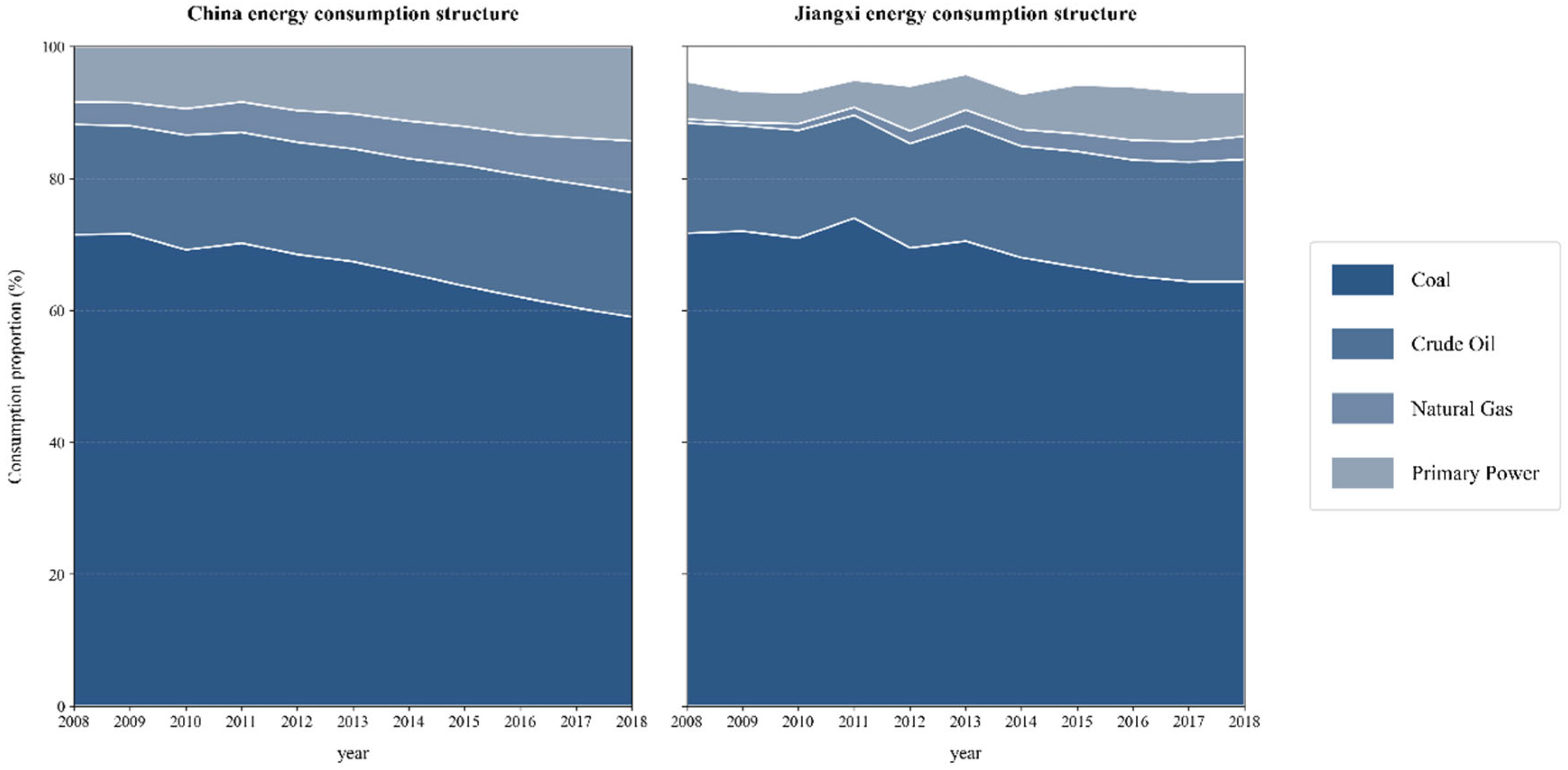 Figure 4, a comparison of energy consumption structures shows that Jiangxi’s reliance on traditional fossil fuels closely tracks the national pattern. In 2018, coal accounted for 64.4% of Jiangxi’s primary energy consumption, considerably higher than other energy sources, while the national average share of coal stood at 59.0% in the same year. This structural similarity indicates that the energy challenges faced by rural Jiangxi are largely representative of those confronting rural China as a whole.
