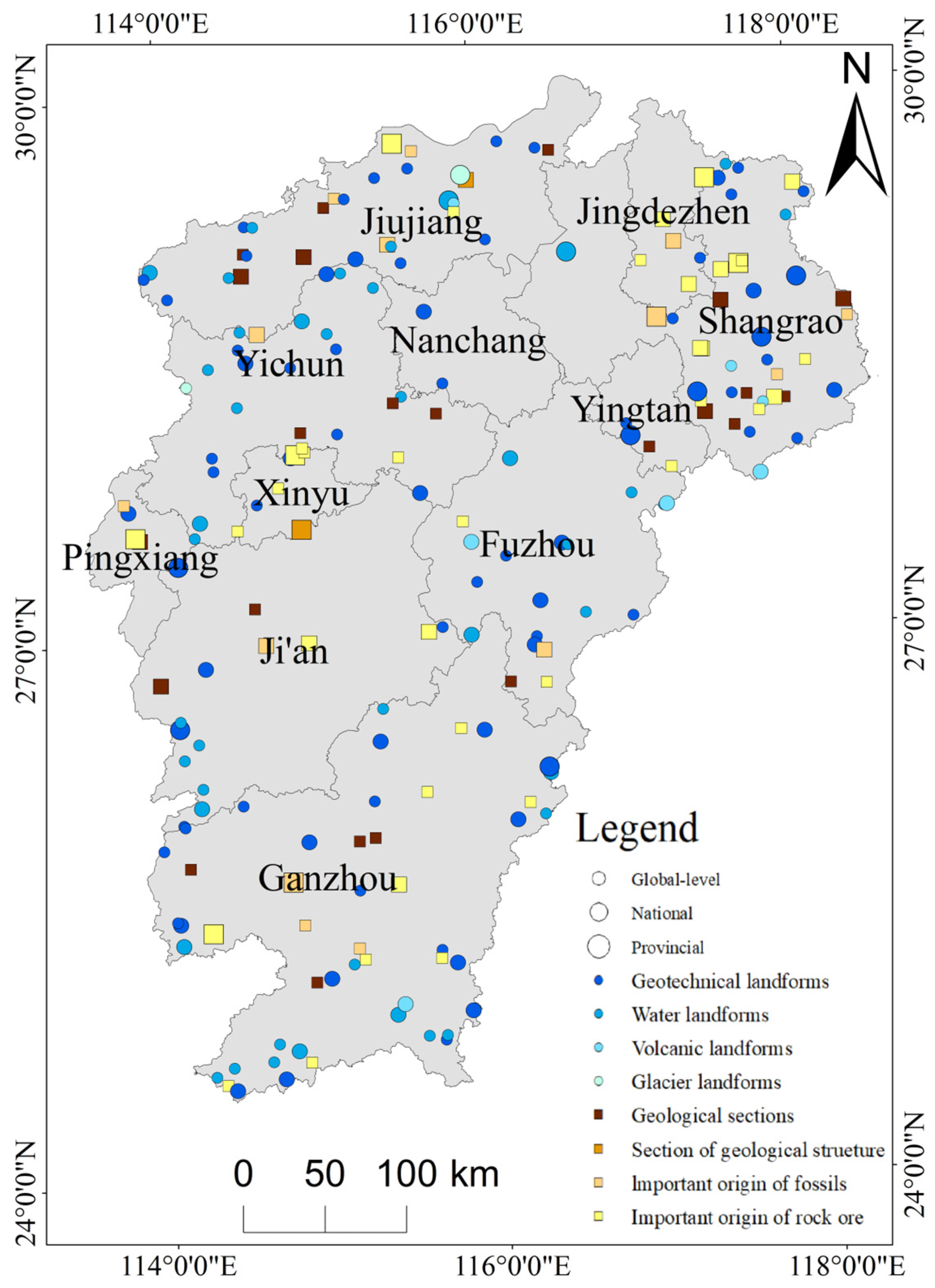 - Key geoheritage sites are primarily distributed along the Gan River, its tributaries, and major mountainous terrains.